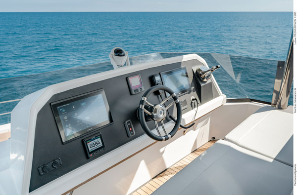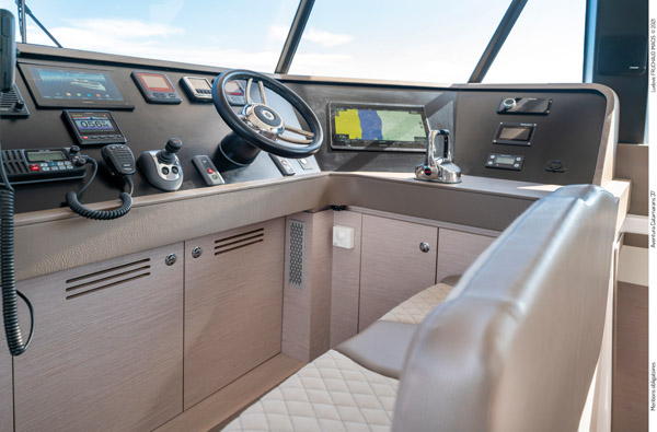 Le poste de pilotage à l’intérieur est très ergonomique et bien équipé. La timonerie avec sa banquette double est très confortable pour faire de longs quarts en toute convivialité.