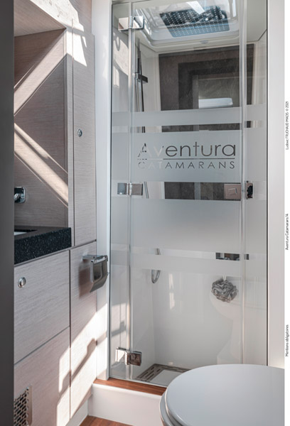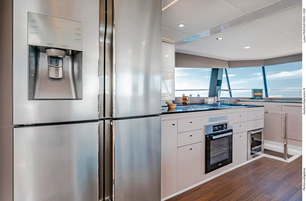 Les plans d’aménagement concoctés par Lasta Design Studio, s’ils permettent de disposer de six cabines doubles et d’offrir à une grande famille le confort d’une maison sur l’eau, autorisent, en réduisant le nombre de couchages, à disposer d’une cabine Propriétaire gigantesque qui occupe tout ou partie d’une coque. Cette suite gigantesque possède tous les attributs du luxe. Sous l’emplacement du panneau de descente arrière, condamné pour la circonstance, se trouve un dressing très lumineux et très vaste. De l’autre côté du lit king size, un bureau surmonté d’une grande télévision (option) fait face à un petit canapé. Vers l’avant, une salle d’eau précède une autre cabine double, de l’autre côté de la descente. Mais il est tout à fait possible de profiter de l’intégralité de la coque avec un deuxième dressing, des toilettes séparées et une salle de bains à double vasque n’ayant rien à envier aux chambres des hôtels les plus prestigieux. Selon la formule choisie, deux ou trois autres cabines doubles complètent cette distribution, qui pourra être gérée par trois membres d’équipage pour un service de qualité. Le seul bémol à cette ergonomie qui fonctionne de façon métronomique est l’accès sur la coque bâbord en redescendant du fly – ce passage mérite un meilleur traitement. La polyvalence de l’Aventura 14 est bien assistée par des équipements adaptés à la tâche. La cuisine dans le carré offre un très beau plan de travail, un réfrigérateur congélateur de 600 litres, un lave-vaisselle 12 couverts et une cave à vin. Une plaque et un four à gaz raviront les cordons bleus. Un air conditionné de 60 000 Btu et un chauffage Webasto permettent de rafraîchir ou de réchauffer le bord. Les installations télévision et audio sont possibles dans toutes les cabines. Côté production d’énergie, le chantier a misé sur du conventionnel : générateur de 15 kW et batteries de servitude supplémentaires. Le constructeur propose tout de même six panneaux solaires et, au cas où vous ne prendriez pas le hard top de fly avec le toit souple, une dizaine d’autres panneaux solaires pourraient être disposés, car la surface est grande. L’équipement standard est d’un bon niveau, mais, disons-le, il convient de cocher les cases de nombreux équipements optionnels sur une telle unité, à l’instar du Pack Privilège à près de 120 000 €. Il ne sera pas possible de disposer d’une unité exclusive sans s’offrir a minima le même montant dans les options de confort diverses. Mais, le powercat étant tarifé à moins de 700 000 € HT en prix de base, il faut reconnaître que le niveau de prestation du rapport confort/habitabilité est plus qu’intéressant. Mais voyons maintenant, sur un plan plus subjectif, si le terme de « luxe » est ici réellement approprié.