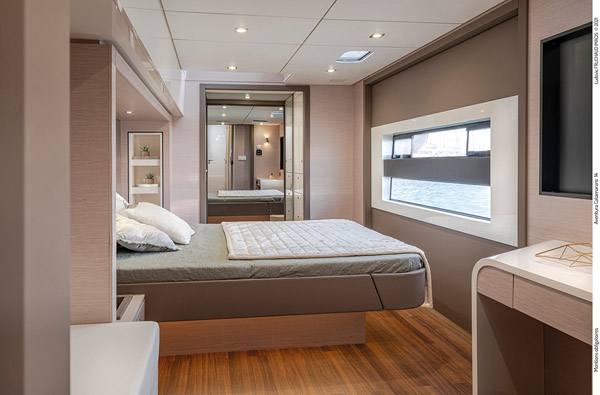 La cabine Propriétaire est vraiment très vaste. Le puit de lumière qui éclaire le fond du dressing provient du panneau de descente de la cabine arrière, condamné dans cette configuration.