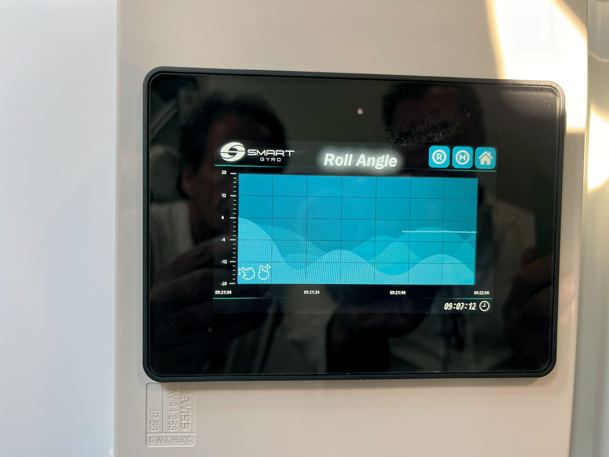 L’économie est donc bien réelle, même avec des moteurs plus puissants, mais ce n’est pas le seul point important. Dans les courbes, la tendance du powercat (à moins qu’il ne s’agisse d’une unité compacte équipée de hors-bords) est de prendre de la gîte vers l’extérieur de la courbe là où on préférerait l’inverse. Ce comportement n’a rien de dangereux à bord des grandes unités, mais ce n’est pas agréable – raison pour laquelle le BGM75 est équipé de doubles stabilisateurs gyroscopiques SmartGyro (voir encadré). Il y en a un dans chaque coque et ils fonctionnent ensemble, reliés par une centrale de calcul. La démonstration de la correction d’assiette latérale est encore plus probante au mouillage – le catamaran étroit est certes naturellement plus stable qu’un monocoque, mais moins qu’une plate-forme extralarge. Lors de notre essai, nous avons fait l’expérience de stopper la marche du multiyacht en le positionnant travers aux vagues de sillage et de mettre on non le système de stabilisation en route. Verdict : la différence de comportement est notable et il devient dès lors possible de passer à table même dans les mouillages exposés à un fond de houle de travers.