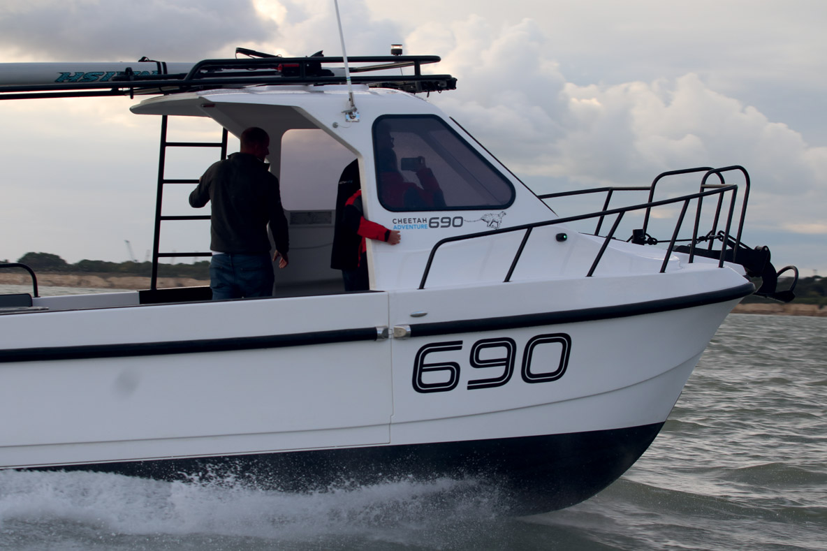 La genèse de ce petit powercat est intéressante, puisqu’il s’agit d’une évolution d’un modèle utilitaire pour la plaisance. Robustesse, rusticité et esprit pratique sont toujours bien présents à bord de ce modèle de la gamme Adventure, mais des aménagements spécifiques permettent à des plaisanciers d’en profiter pleinement… Nous avons pu découvrir ce concept de plus près lors du dernier Grand Pavois de La Rochelle, où le Cheetah Adventure 690 était présenté.