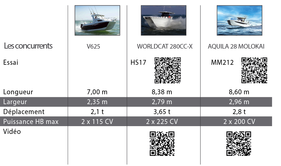 Dans le chenal du port, nous sommes accueillis par un vent de mer modéré et un petit clapot. La vitesse est logiquement limitée à 5 nœuds jusqu’à la dernière paire de bouées verte et rouge ; c’est parti pour le test ! A défaut d’un design de carène à la mode, le Cheetah 690 s’appuie sur l’expérience de son constructeur en matière de qualités marines. Difficile de douter, en la matière, de l’expérience de l’équipe qui conçoit ces powercats destinés aux usages les plus exigeants. Pas de confort feutré, mais des mouvements souples et rapidement amortis. Face au clapot, quelques embruns – faute de déflecteurs et/ou de redans suffisamment efficaces – s’invitent à bord. On est parfaitement protégés dans la timonerie ouverte – un peu moins quand on est placé plus en arrière dans le cockpit. Le vitrage déperlant retenu permet de se passer d’essuie-glaces. Nous disposons de la motorisation la plus puissante avec 2 x 100 CV ; le constructeur propose également deux paires de 80 CV ou 90 CV. Le range est donc relativement serré dans un registre qui n’a rien à voir avec les puissances habituellement validées aux Etats-Unis. De fait, les performances sont plutôt sages. La vitesse max avec les 2 x 80 CV est de l’ordre de 20 nœuds, 24 avec 2 x 90 CV, alors que nous avons atteint 28,2 nœuds avec nos 2 x 100 CV. Côté accélération, il nous a fallu 7,81 s pour atteindre 20 nœuds (déjaugeage vers 11 nœuds à 2 800 tr/min). Des chiffres à mettre en perspective avec ceux de l’Aquila 28 Molokai – 0 à 20 nœuds en 3,8 s et 40,8 nœuds de vitesse max – et du WorldCat 280CC-X – 0 à 20 nœuds en 5 s et 43 nœuds de vitesse max. Précisons que ces deux powercats que nous avons pu essayer étaient dotés de 2 x 200 CV – et présentent des coques un peu plus longues. Logiquement, la consommation du Cheetah est raisonnable, puisqu’on parvient, à pratiquement 17 nœuds, à brûler 1,4 l de carburant par mille parcouru.