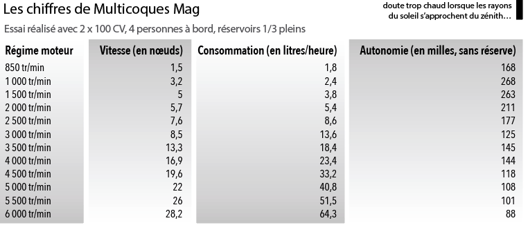 En revanche, les réservoirs livrés (2 x 100 l) n’autorisent pas de très longues traites, avec une autonomie inférieure à 200 milles dès les 6 nœuds dépassés.