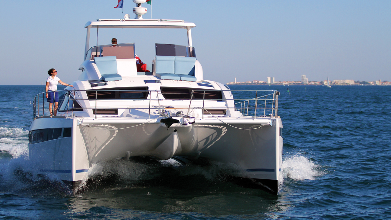 L’écartement des coques offre une grande facilité de manœuvres quand on inverse les gaz ; pas besoin de propulseur d’étrave. Aux commandes, confortablement installé sur le flybridge, la vue est excellente sur le plan d’eau. La plate-forme masque toutefois les poupes – il suffit de reprendre les commandes à un second poste de pilotage installé à l’arrière bâbord. On est surpris par le faible bruit des moteurs – on passe tout de même de 2 x 75 CV sur le Serie 5 à 2 x 320 CV ! Sortis un peu au large du chenal des Sables d’Olonne, on peut pousser les manettes. La barre offre une sensation inédite : elle est très douce, et surtout revient en ligne droite quand on la lâche, comme une direction assistée de voiture. Avec sa commande électro-hydraulique, la barre gère indépendamment les deux safrans – pas de liaison entre les deux. On peut intervenir sur les réglages de ce système de direction, lequel se met en route dès l'allumage des moteurs.Possibilité de synchroniser les deux moteurs – la manette gauche peut tout commander.