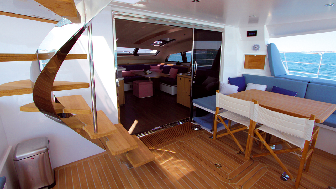 Encore un ! Encore un catamaran qui abandonne son gréement et adopte des puissants moteurs, histoire de s’affranchir du vent contraire, des calmes, et bien sûr de la gestion des voiles. Une tendance de fond qui pourrait inciter certains constructeurs à se lancer à la va-vite sur ce nouveau marché plein de promesses. Rien de tout ça chez Privilège Marine où l’étude, la construction et la mise au point de cet Euphorie 5, qui dispose comme base de travail du Serie 5, ont pris plus de deux ans. Et le résultat est clairement à la hauteur. Cette unité se veut luxueuse et compatible avec les desideratas des propriétaires les plus exigeants en termes d’emménagements, de finition et d’équipements. C’est bien le cas. La silhouette de l’Euphorie 5, vue du ponton, en impose. Force est de reconnaître que Marc Lombard a fait du bon boulot sur le plan esthétique. Le rouf en sifflet confère un zeste d’agressivité qui se marie parfaitement avec le flybridge plutôt bas et son T-top aérien. Les étraves verticales et légèrement tronquées à hauteur du pont paraissent plus agressives que celles du Serie 5 – ce sont pourtant les mêmes. Construction tout sandwich PVC/verre identique, y compris pour les cloisons structurelles. Et bien sûr des crash-boxes aux étraves comme aux poupes.