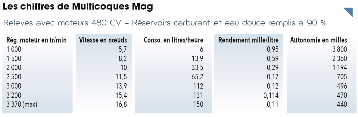Le powercat est capable d’atteindre 20 noeuds à vide (soit environ 6 tonnes de moins que notre configuration d’essai). Depuis le fly, à plus de quatre mètres, le pilotage est très agréable et la vision sur le plan d’eau bleu profond est parfaite. En configuration charter, la vitesse de croisière rapide se trouve juste après le déjaugeage, à 15 noeuds. A cette vitesse, la consommation s’établit à 130 litres/heure – cela reste bien plus économique qu’avec un monocoque de 80 pieds (à prestations égales). La très bonne insonorisation des compartiments moteur rend le niveau sonore tout à fait supportable. En régime de croisière type trawler à 10 noeuds et en fermant la baie vitrée du salon, on n’entend presque plus rien. A cette allure, les moteurs ne réclament plus que 33 litres/heure, soit une autonomie supérieure à 1 200 milles. L’assiette du bateau est remarquablement stable ; il est possible de vivre à bord comme à terre.