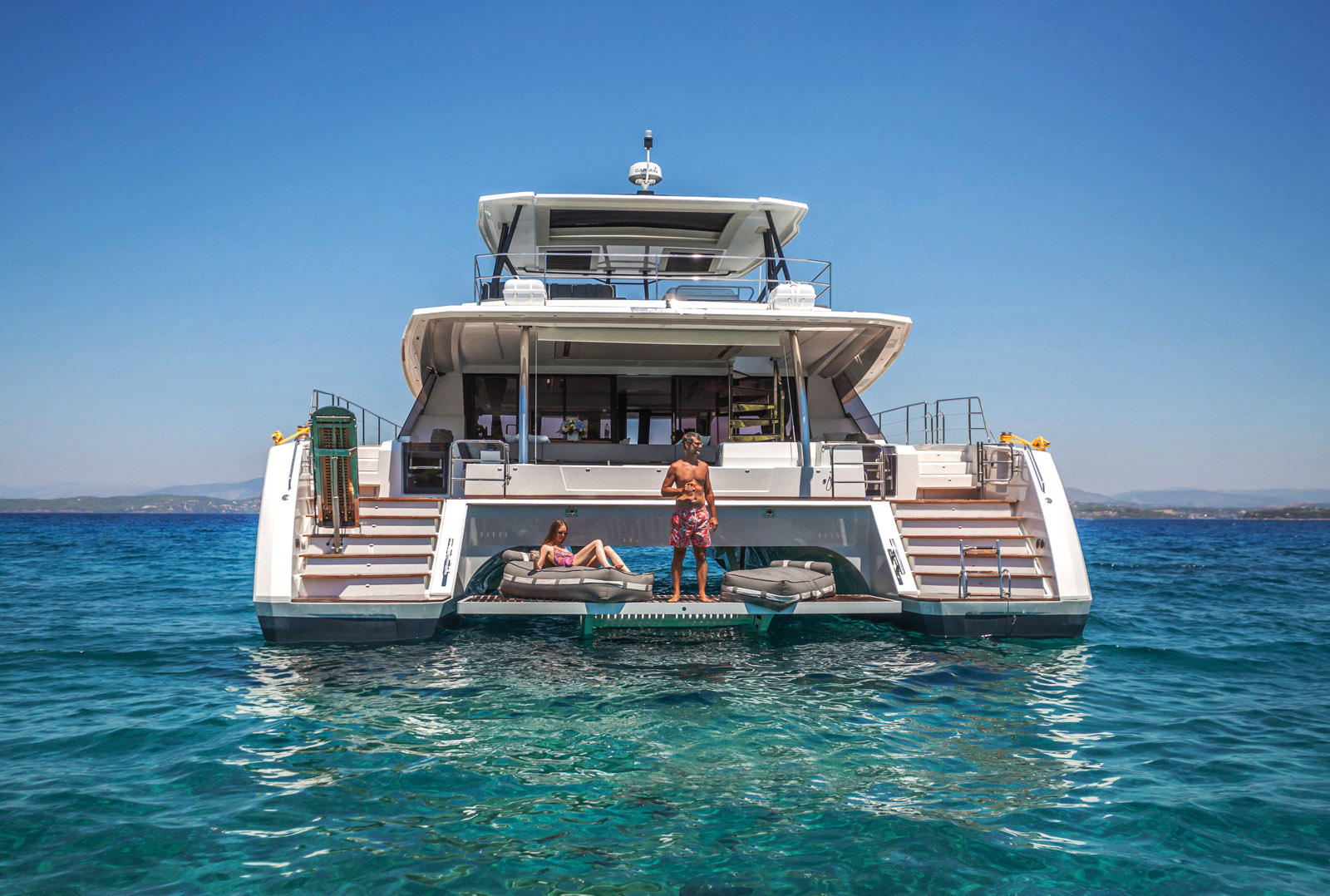 Voilà maintenant plus de 20 ans que le chantier rochelais s’intéresse au marché du catamaran à moteur. A la fin des années 1990, le constructeur assumait une gamme de trawlers, laquelle s’est muée en powercats plus sportifs, avant de se tourner résolument, en 2015, vers une finition plus soignée – bienvenue à la gamme Motor Yacht de 37 à 44 pieds. Plus rapides et luxueux, ces modèles sont destinés à concurrencer les meilleures unités monocoques. Grâce aux qualités intrinsèques de la formule à deux coques, le succès ne s’est pas fait attendre. Mais le Power 67, lui, s’affranchit du vocable MY ; contrairement à ses petits frères, il n’est pas signé Andrieu Yacht Design. Le flagship reprend en effet l’architecture – à l’exception des carènes optimisées pour la propulsion par hélices – de l’Alegria 67, son congénère à propulsion vélique conçu par Berret Racoupeau Yacht Design. Première découverte dans la marina d’Athènes : les proportions du dessin à étraves verticales de Cristal Mio sont bien équilibrées entre coques. Les lignes racées du 67 évoquent le luxe et le confort que nous sommes supposés trouver à bord. Pour autant, on ne devine pas encore l’immense volume dont les passagers vont en réalité bénéficier, une fois la passerelle hydraulique enjambée.