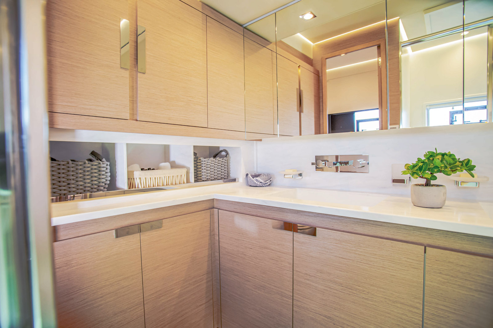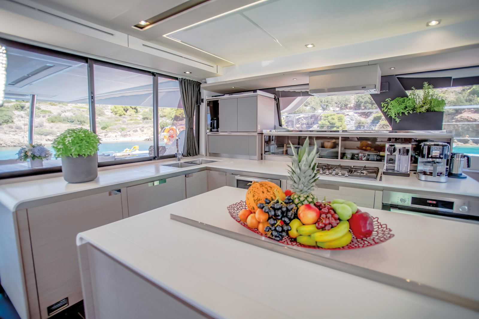 Le constructeur soigne particulièrement les finitions et la liste des options : le bien-être optimal, quel que soit le nombre d’invités, est ici une priorité. Le plan d’aménagement des cabines est astucieux. Les deux cabines arrière disposent d’un accès indépendant depuis le pont. La cabine Propriétaire à tribord est accessible depuis le carré, mais elle possède une autre sortie sur la plage avant. Deux autres cabines à bâbord portent leur nombre à cinq, mais il peut y en avoir six, ou quatre seulement si l’on prend l’option de la cuisine dans la coque bâbord. Les boiseries en chêne clair contrastent avec les planchers plus sombres. Les plans de travail en Corian crème et les cuirs magnolia des banquettes apportent une ambiance douce et feutrée – mais qui reste moderne. La literie haut de gamme procure un excellent confort. La suite Propriétaire de 22 m² mérite une mention particulière ; avec ses deux accès, sa grande salle de bains et sa bibliothèque, elle se révèle parfaite pour se ressourcer. Sur le pont principal, la baie vitrée du salon s’ouvre en grand, découvrant la perspective sur un très grand espace de réception. La table est soit basse, soit haute, sur le même principe que celle du salon – cette dernière permet de prendre ses repas à l’intérieur en regardant l’écran multimédia. La méridienne fait face à la timonerie intérieure et jouxte la cuisine – si celle-ci est dans le salon. Une version avec cabines Propriétaires plus deux VIP avec la cuisine dans la coque bâbord (et une cabine équipage contiguë) pourra encore augmenter le niveau de prestations pour une utilisation strictement privée ou charter très haut de gamme. A ce titre, la liste des équipements est calibrée pour les plus hautes exigences : on compte huit compartiments froids, des écrans de 50 pouces, une plancha extérieure, un jacuzzi sur la plage avant et une climatisation. La production d’énergie pour alimenter tout l’électroménager et le système hydraulique est adaptée pour faire face à la consommation.