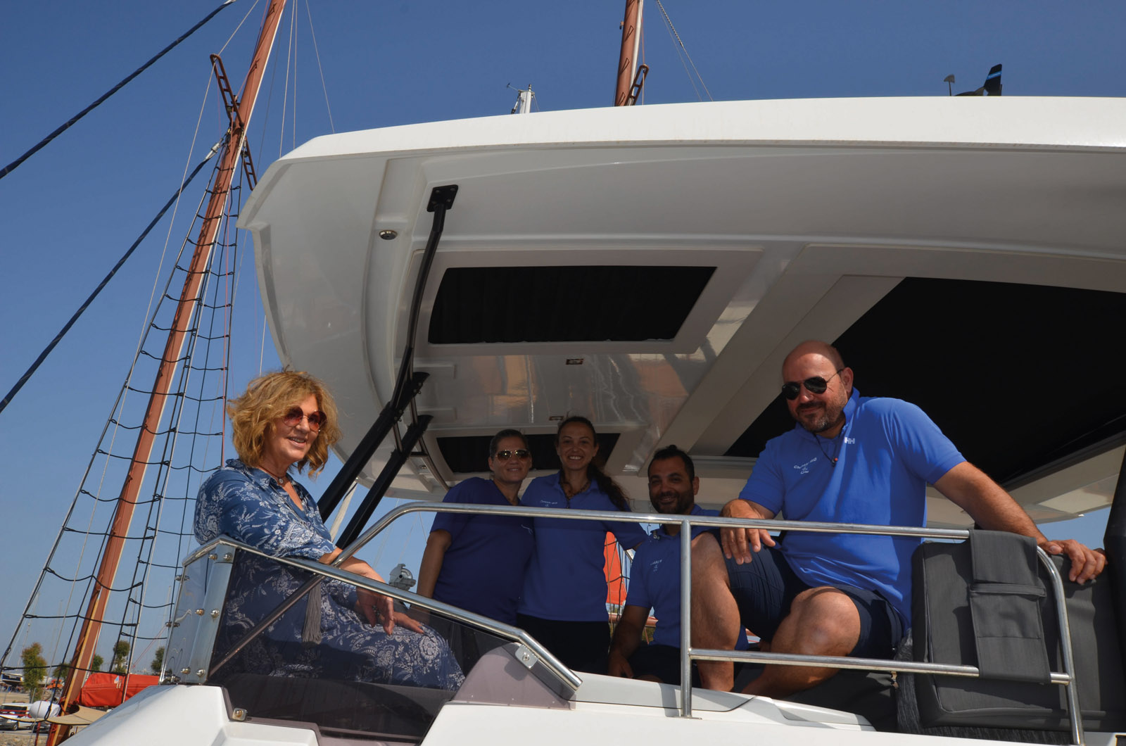 L’équipage de Cristal Mio, le Power 67 exploité en charter de luxe au départ d’Athènes. A gauche, Barbara Gabriel, aux commandes de l’agence FYLY Exclusive Yachts. Avec ses 30 ans d’expérience dans l’univers du yachting, elle est une figure du nautisme en Grèce. C’est donc dans le Péloponnèse que Barbara Gabriel, la directrice de FYLY Exclusive Yachts, nous offre l’occasion – le temps de quelques heures – de naviguer en mode charter de luxe. L’équipage est donc au grand complet, c’est-à-dire le capitaine, le marin, une chef et une hôtesse. Les cabines sont toutes préparées avec de la lingerie et de la literie siglées, comme dans un hôtel cinq étoiles. Les six réfrigérateurs, les deux congélateurs ainsi que la cave à vin sont avitaillés, nous partons donc en mer avec la certitude d’être choyés, rien ne manque, y compris une multitude de jouets nautiques dans les grandes soutes. Sur cette version, quatre cabines invités plus une cabine master peuvent recevoir 10 personnes dans des conditions optimales. L’équipage, qui loge dans les cabines avant, nous accueille avec une petite collation, nous apprendrons plus tard que la devise de Barbara est d’avoir toujours quelque chose à grignoter sur la table. La semaine de charter est facturée de 30 000 à 42 000 € HT en fonction de la saison. Il conviendra d’y ajouter 13 % de TVA et environ 20 % de dépenses supplémentaires pour les frais de port, la nourriture et le carburant.