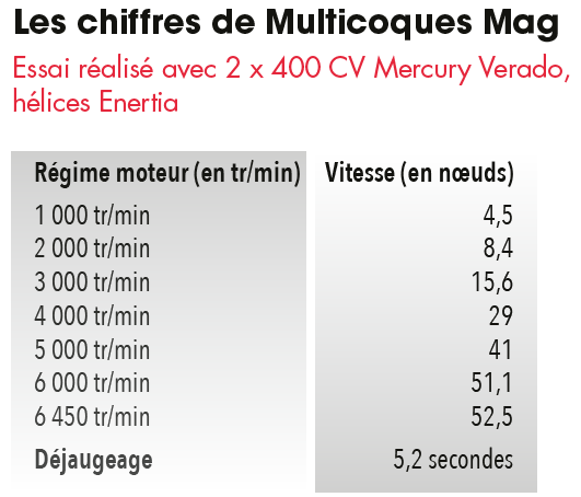 Logeable et accueillant, c’est sous le pont que ce canot cache son atout majeur. Contrairement à nombre de catamarans, y compris dans le domaine du fishing, ce bateau conserve une largeur modérée (3,10 m). Qui plus est, il s’appuie sur deux coques très fines et surtout très hautes sur l’eau, ce qui dégage un tunnel de taille respectable. Le profil de carène de chaque coque est intéressant, avec une étrave très droite, un bouchain qui part directement de l’étrave, et des virures imposantes pour assurer l’accroche et la stabilité latérale. Une mini coque centrale vient prendre place sous le tunnel pour modérer les ardeurs du coussin d’air et le tout présente un profil légèrement asymétrique. Un dessin complexe, mais qui a du sens. S’ajoutent à cela une répartition des masses sans erreur et un très bon contrôle de l’assiette. Concrètement, on se retrouve avec un catamaran qui ne se cabre pas au départ et qui déjauge très rapidement. Mieux, une fois dans ses lignes, l’Invincible trace sa route sans sourciller, se moquant littéralement du clapot. Il est comme sur des rails. Autre petit miracle de cette carène, le catamaran vire quasiment à plat, sans survirer. C’est dans les courbes que l’on reconnaît d’ailleurs qu’une coque est saine. Un élément primordial pour le chantier, qui insiste sur le fait que les modèles de la marque n’ont pas besoin de flaps pour bien naviguer. Lors de notre test, malheureusement un peu court, nous avons pu mesurer tout le bien-fondé de ce profil. Efficace, confortable et plutôt alerte, le catamaran n’a jamais été pris en défaut, et les virages s’effectuent effectivement à plat. Pour être franc, nous aurions vraiment apprécié un peu plus de vague pour mettre à l’épreuve cette embarcation. Une chose est sûre : il en faut beaucoup pour commencer à mettre l’Invincible 33 en difficulté. Taillé pour aller pêcher au large, il remplit parfaitement sa tâche, et avec en plus une bonne dose de confort. Question performances, nous avions accroché aux tableaux arrière deux moteurs Mercury Verado de 400 CV. Une puissance conséquente qui peut encore monter un peu, puisque le powercat est homologué jusqu’à 900 CV, rien que ça. Si là encore nous n’avons pas pu effectuer totalement les tests que nous réalisons d’habitude, le canot s’est tout de même extirpé de l’élément liquide en à peine plus de 5 secondes. Le déjaugeage s’effectue autour de 3 200 tr/min, ce qui amène déjà l’ensemble à environ 20 nœuds. En poussant la poignée, la prise de vitesse est linéaire, puisque rien ne semble perturber le comportement du catamaran. Une fois que l’Invincible est dans ses lignes, le coussin d’air dans le tunnel joue son rôle à plein en sortant un peu plus l’embarcation de l’eau, ce qui diminue sa surface mouillée, et donc améliore performance et consommation. Ce coussin agit également comme un amortisseur, ce qui rend le voyage encore plus confortable. Dès lors, on atteint une vitesse de croisière située autour de 40 nœuds, juste au-dessous des 5 000 tr/min. Une allure élevée qui permet d’aller pêcher assez loin sans pour autant vider le réservoir trop vite. A 30 nœuds, à 4 000 tr/min, chaque moteur consomme 50 litres/heure, soit 100 au total. L’autonomie est à ce régime de 454 milles. Ce jour-là, notre vitesse maximale plafonnera à 52,5 nœuds, mais le constructeur annonce une vitesse de 57 à 58 nœuds en pointe, peut-être avec la motorisation maximale… Reste qu’avec une capacité d’évolution à plus de 50 nœuds, le 33 autorise un programme ambitieux, que ce soit pour aller chercher un ban de thon au large, ou simplement pour emmener la famille en balade pour la journée.