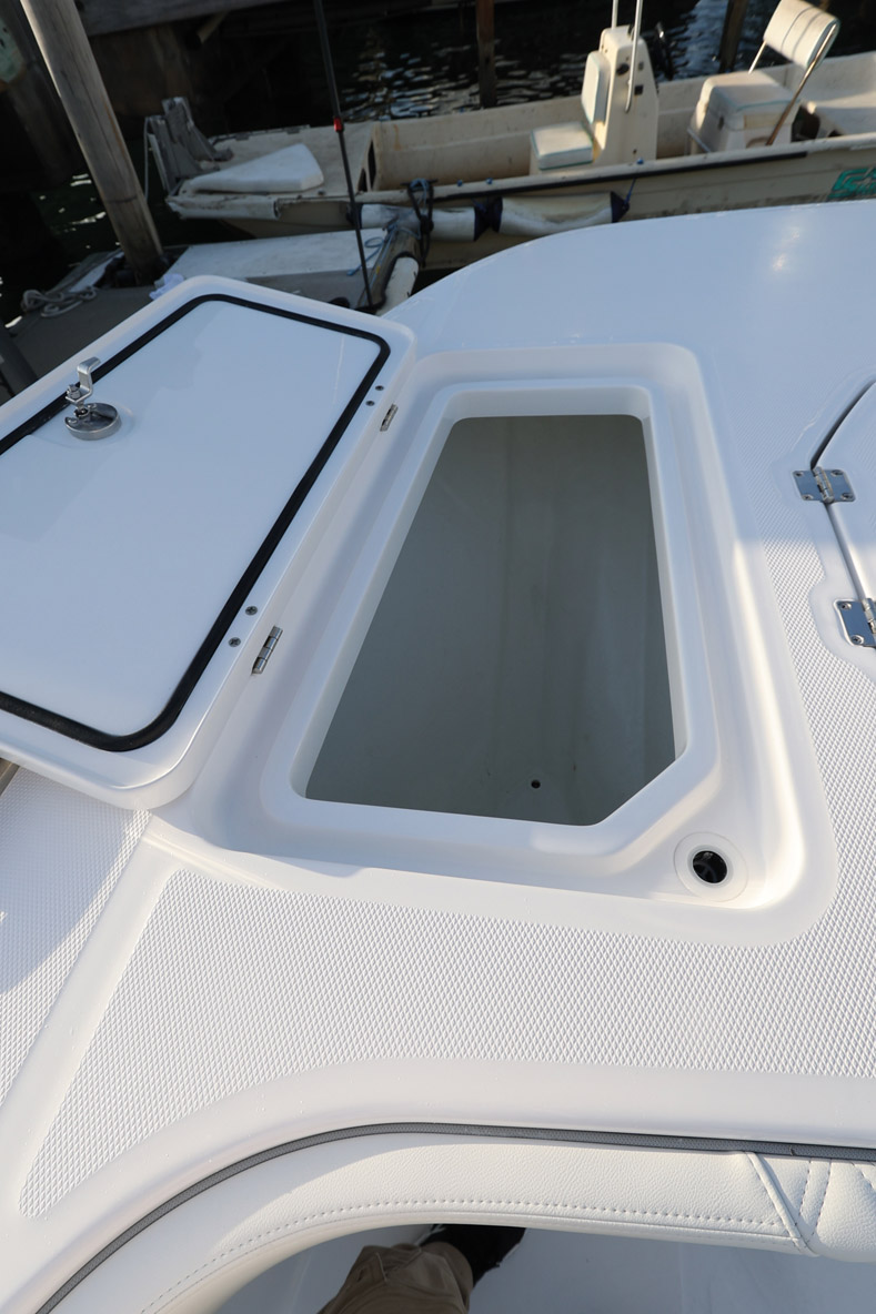 Petite concession au confort lorsque l’on fait de la route, ce cockpit offre une banquette arrière face au sillage pour trois personnes. Particulièrement confortable, cette dernière cache un rangement sous l’assise et, en abaissant le dossier, on découvre quatre tiroirs et un rangement pour les boîtes à leurres, ce qui confirme la vocation pêche de l’Invincible.