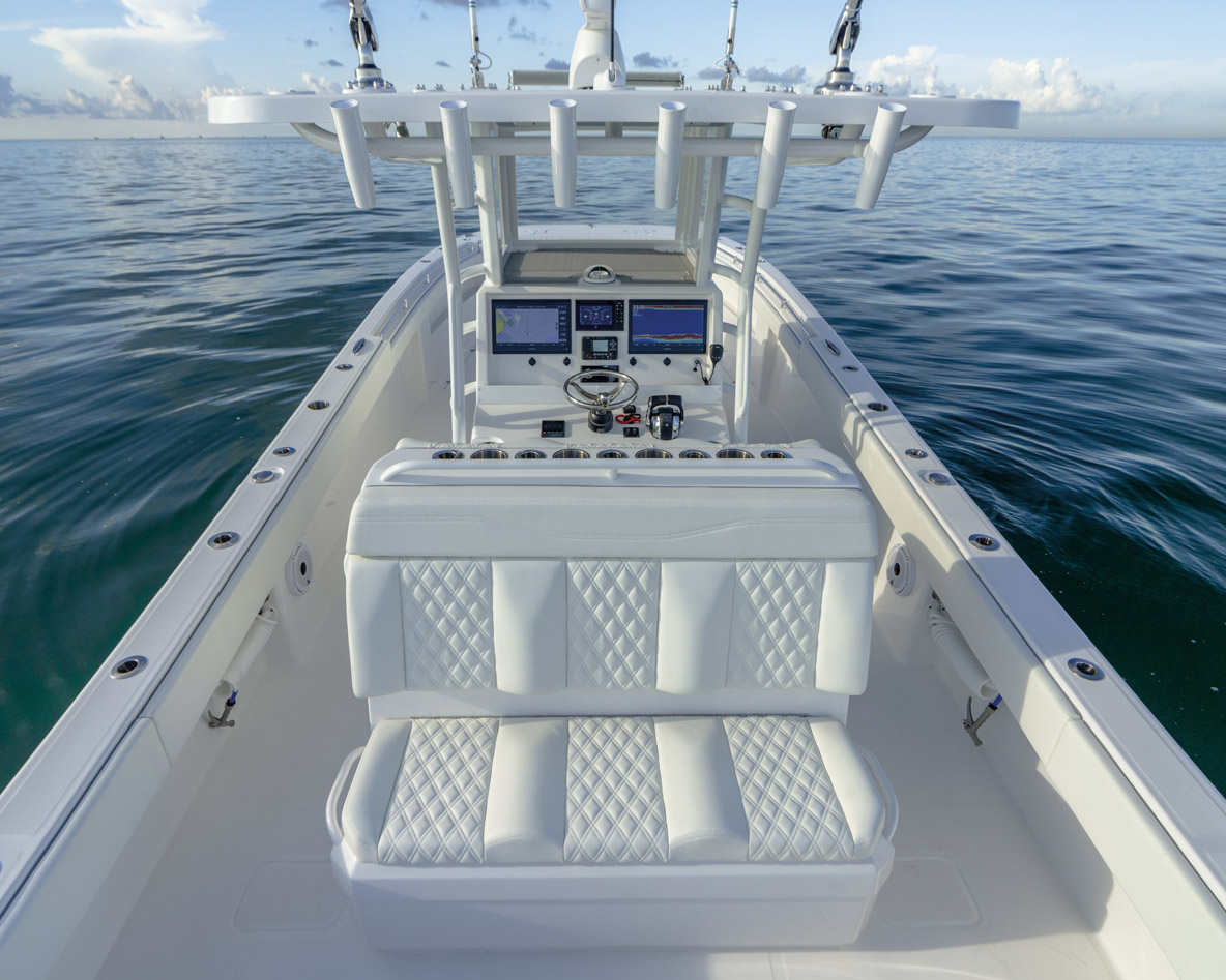 Reste la partie centrale, occupée comme il se doit par une grosse console. Dans le plus pur style fishing, ce poste de commande monte assez haut, ce qui offre une protection efficace tout en dégageant assez de place pour installer deux écrans de belle taille et des accessoires supplémentaires, comme un smartcraft, une VHF ou le système audio. La partie inclinée permet quant à elle de recevoir un des porte-gobelets, un joystick ou autres éléments nécessaires. Bon point encore pour la fargue constituant un vide-poche sur toute la largeur ou pour le coussin protégeant les genoux du pilote et du copilote. L’ergonomie est d’ailleurs de la partie, puisque l’on profite d’un repose-pieds, tandis que la banquette trois places demeure très confortable. L’ensemble du poste de conduite est efficacement protégé par un pare-brise et deux vitres latérales pour les escapades au large. Enfin, le solide T-top permet de rester à l’abri du soleil ou de la pluie, et supporte les cannes de traîne, l‘antenne VHF et le radar.