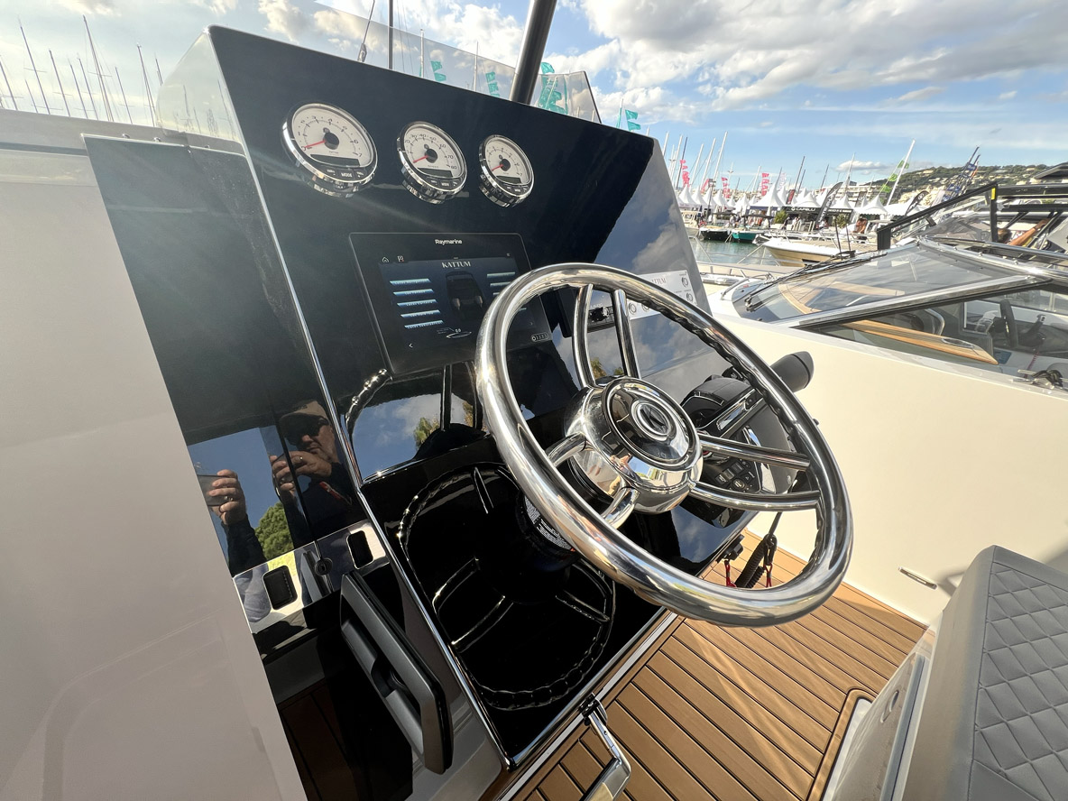 Pour le reste, ce poste de pilotage est plutôt joli et comporte assez d’espace pour installer un bel écran et une VHF – dommage qu’il n’y ait ni fargues ni vide-poches pour les objets personnels, comme un téléphone ou des clés. En revanche, on trouve un chargeur de téléphone par induction sur le côté de la console – très pratique.