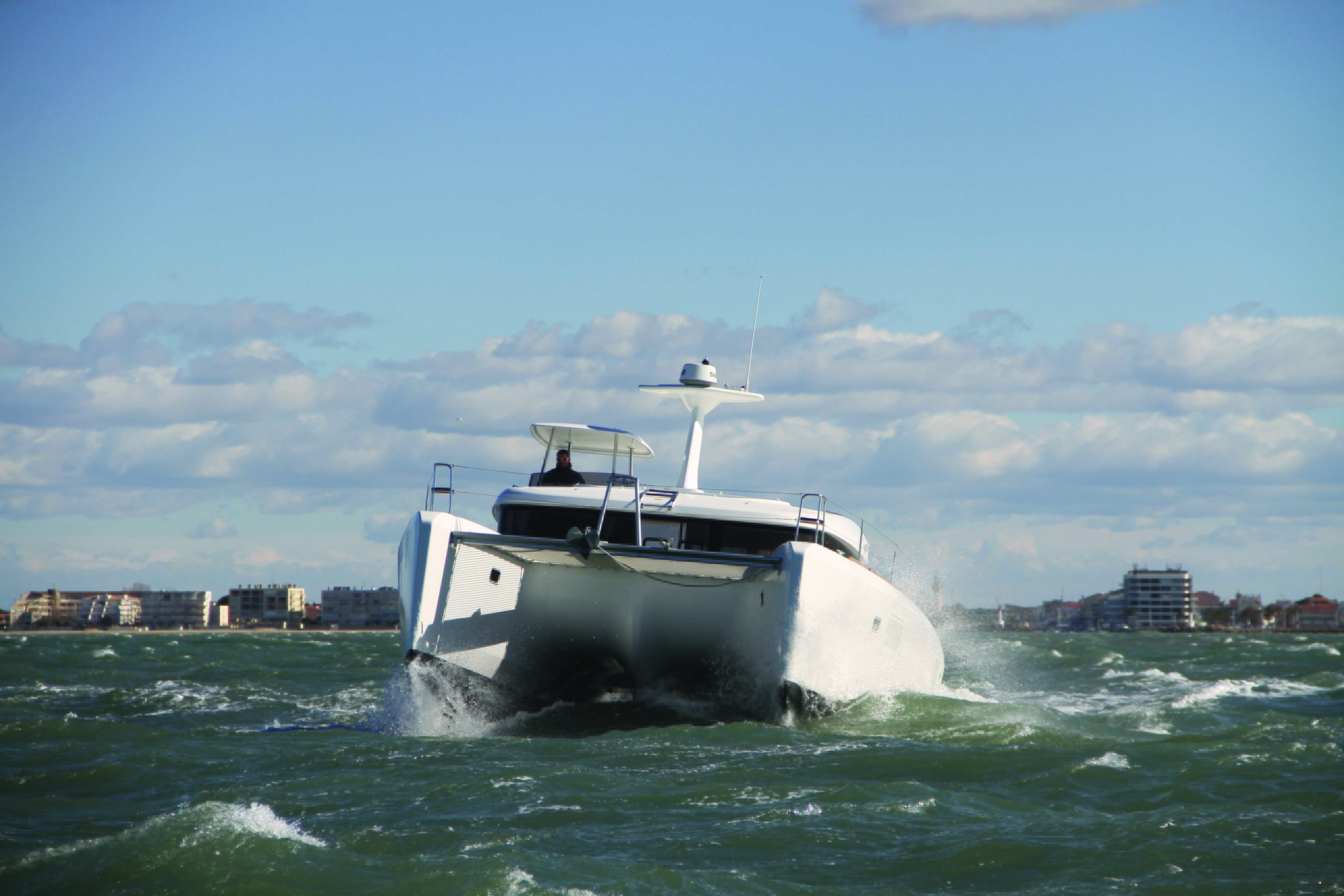 Lagoon, en 2015, n’en est pas à son coup d’essai avec les powercats : le chantier a produit une centaine de Lagoon Power 43 (devenu 44) de 2001 à 2006. Pour son Lagoon 40 MY, le constructeur a opté pour la transformation d’un catamaran à voile existant, le Lagoon 39. Les carènes – ou plus précisément le tiers arrière – ont été modifiées afin d’offrir plus de portance. Il s’agit de lutter contre l’effet de cabrage et contrer le poids supérieur des moteurs. Mais sans aménager des lignes d’arbre quasi horizontales, nous le verrons plus loin. Les coques sont globalement plus fines que celles conçues pour un usage moteur. Ce qui se traduit par une très faible résistance à l’avancement aux vitesses faibles à moyennes, mais également une impossibilité de déjauger franchement. Du coup, les moteurs proposés sont moins puissants ; autant jouer la carte de l’économie de carburant et assumer des vitesses peu élevées. Soit un programme trawler – à ceci près que la connotation vieillotte de ce vocable lui a valu de passer aux oubliettes, remplacé par le plus séduisant Motor Yacht…