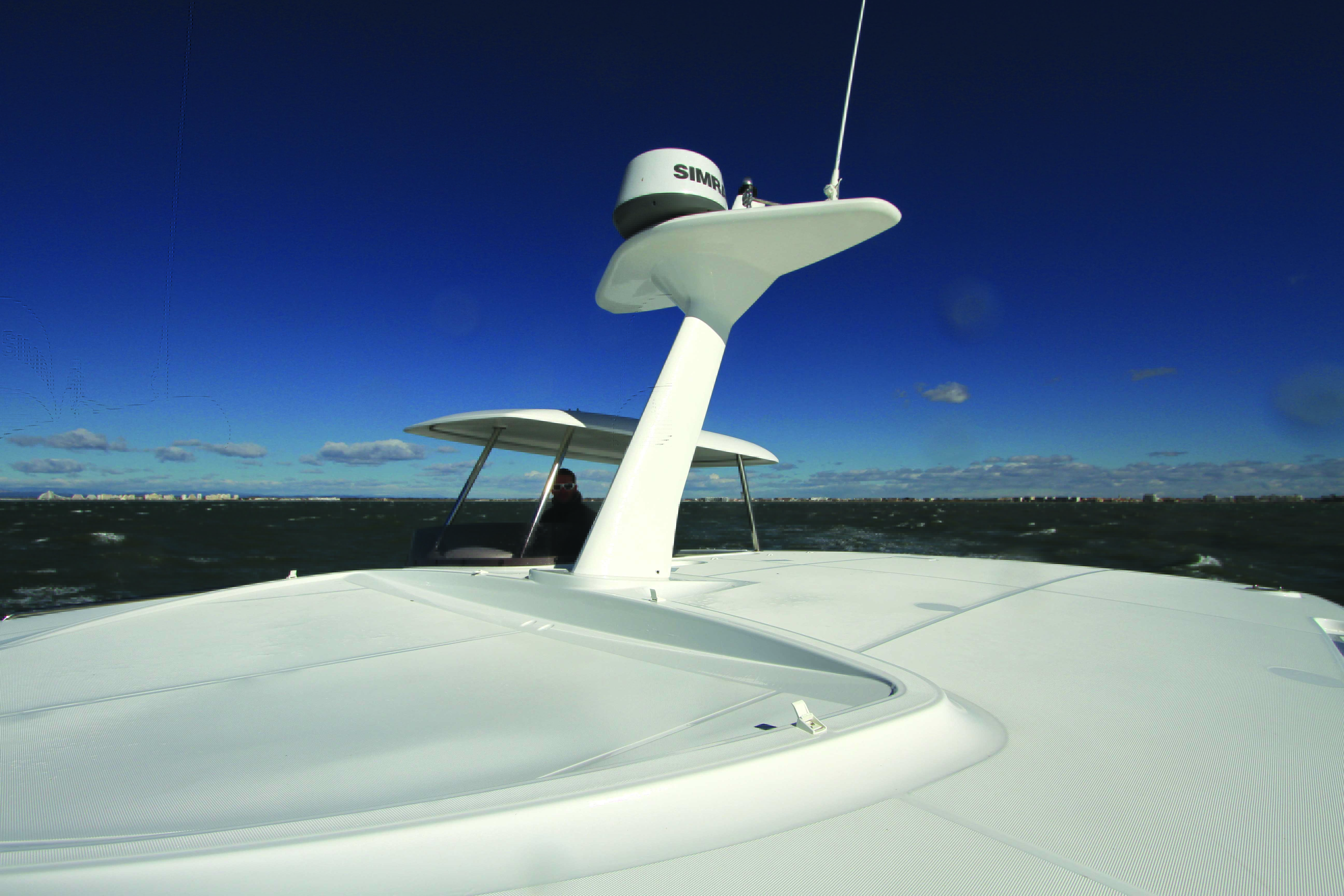 Vu du quai, le 40 MY est plutôt élégant, avec ses étraves droites assorties d’un angle supérieur en diamant. Le bandeau noir qui prolonge les hublots latéraux parvient sur le plan visuel à libérer le rouf des coques, dont le franc-bord élevé passe bien. L’effet « sustentation », expliquait-on chez Lagoon en 2015… Sur le rouf, justement, le mât et l’ensemble du gréement ont bien sûr disparu… Le tout est remplacé par un élégant mâtereau, héritage des premiers Lagoon Power. Sur ce support sont fixés le radôme du radar, les antennes, les feux et la corne de brume.