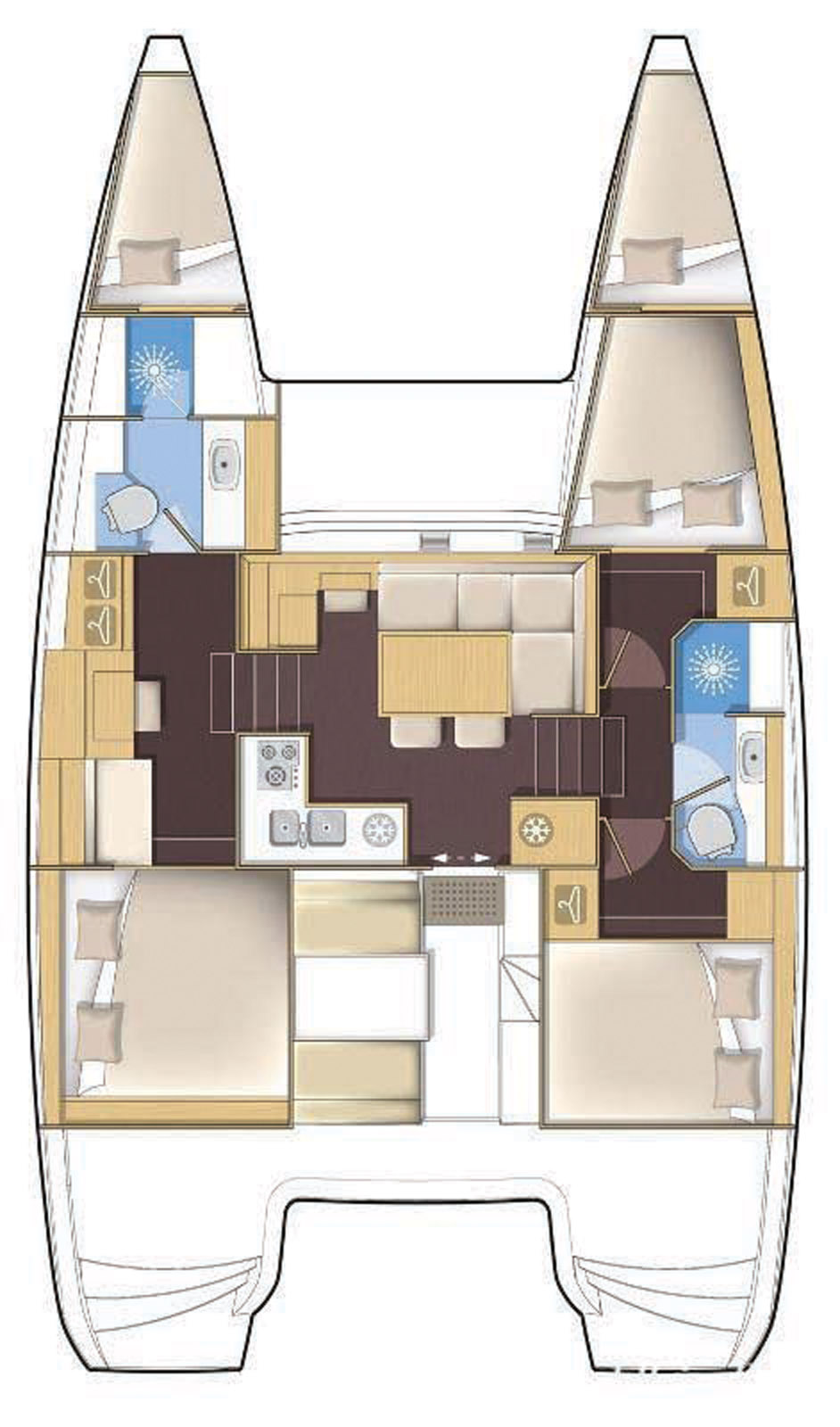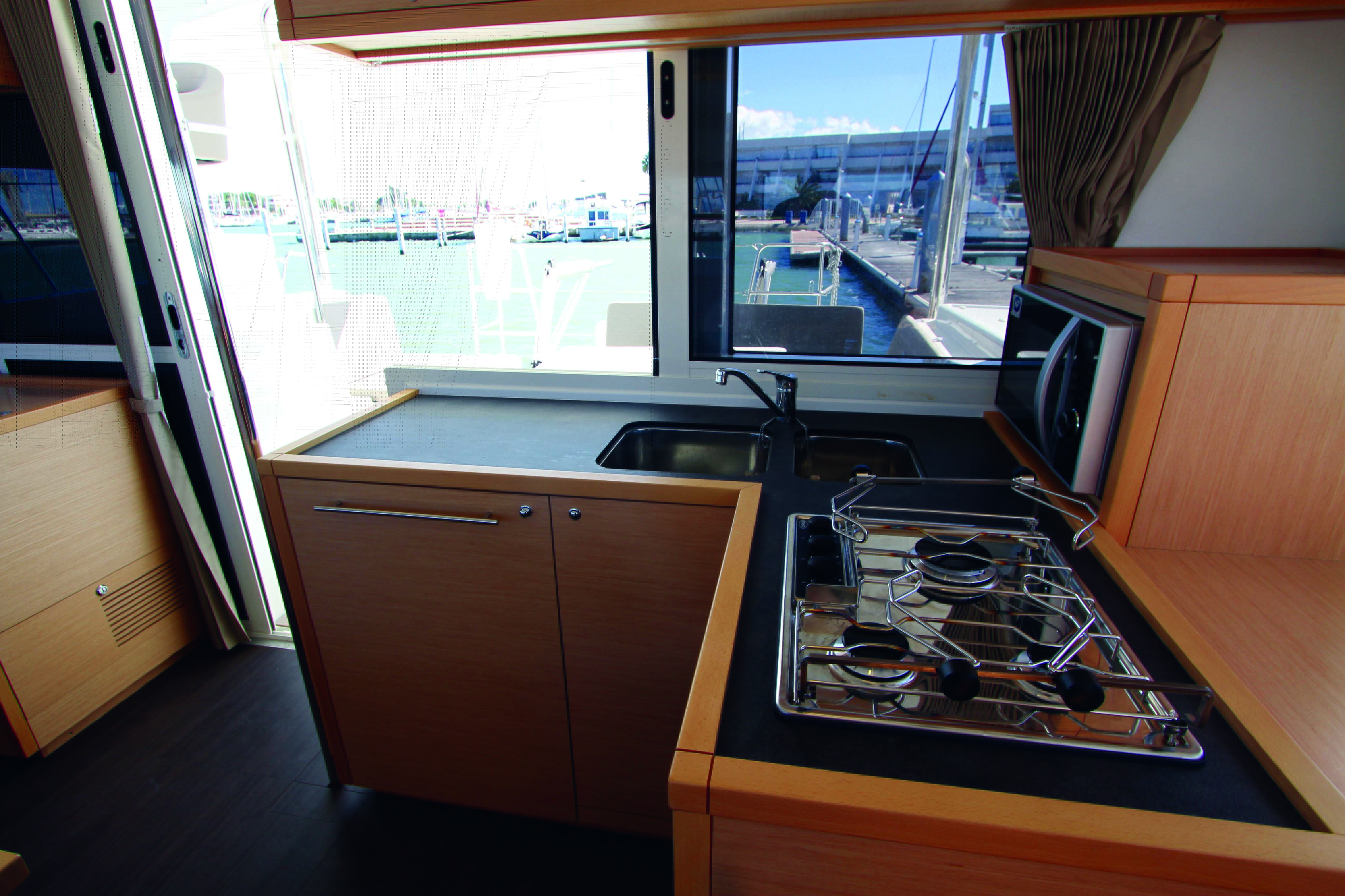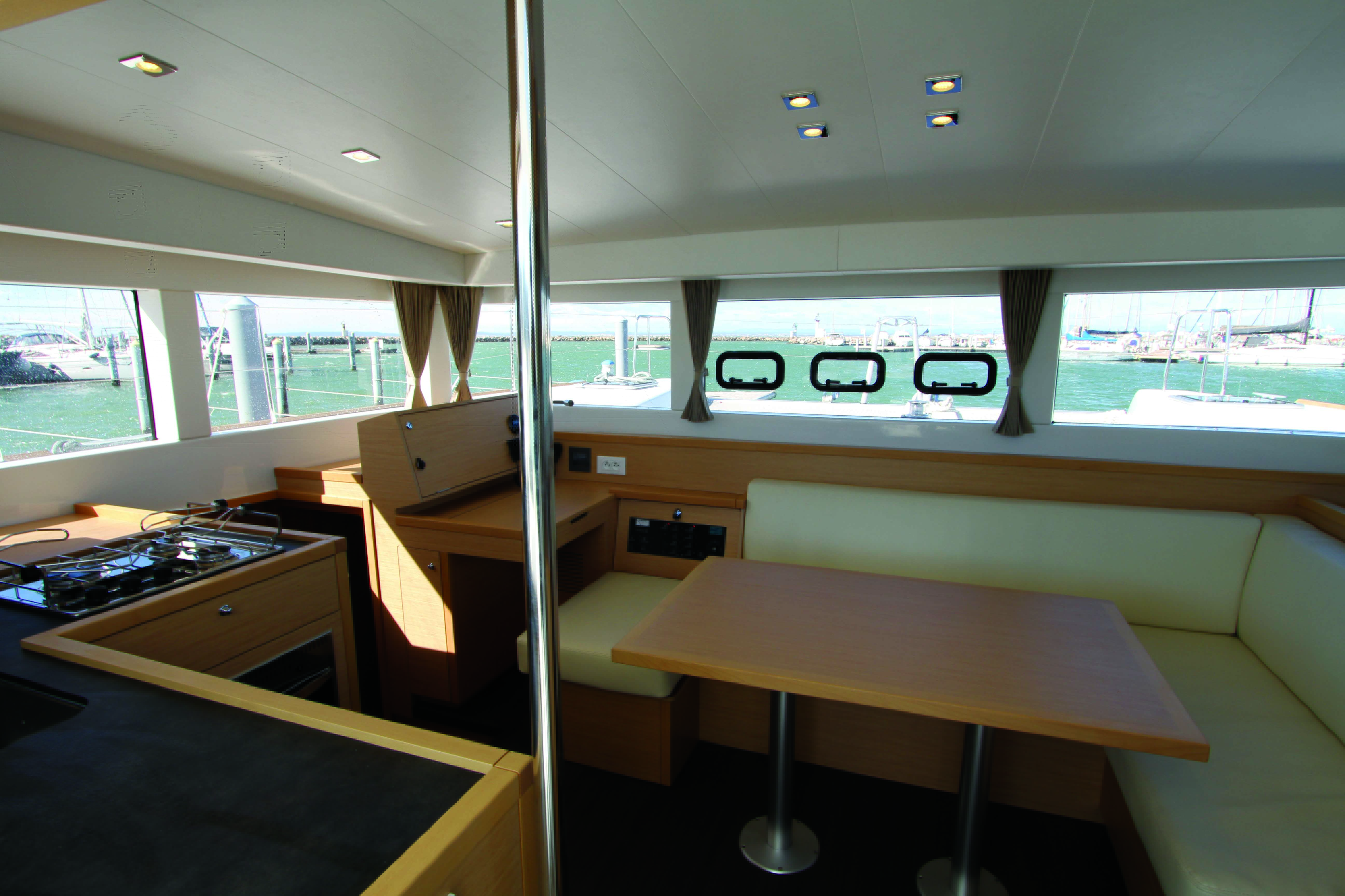 A l’intérieur, la nacelle offre un volume exceptionnel assorti d’une belle vue panoramique. Les hublots et vitrages verticaux sont la meilleure réponse à l’effet de serre. Les rayons verticaux du soleil, les plus chauds, ne les frappent pas. La hauteur sous barrot atteint deux mètres. Comparé à la nacelle du Lagoon 39 – la version voile –, seule l’épontille a disparu ou presque. Tout le reste des aménagements est identique, avec un carré pour six personnes, une table à cartes en L installée travers à la route, une grande cuisine qui s’ouvre directement sur le cockpit et des rangements partout. Quant aux coques, deux versions sont proposées par le chantier : Propriétaire avec coque privative pour l’heureux skipper, qui découvrira un lit king size – oui, oui, deux mètres sur deux ! – et un bureau. Dans l’autre coque, deux cabines et un cabinet de toilette. La version quatre cabines est quant à elle équipée de quatre cabinets de toilette.