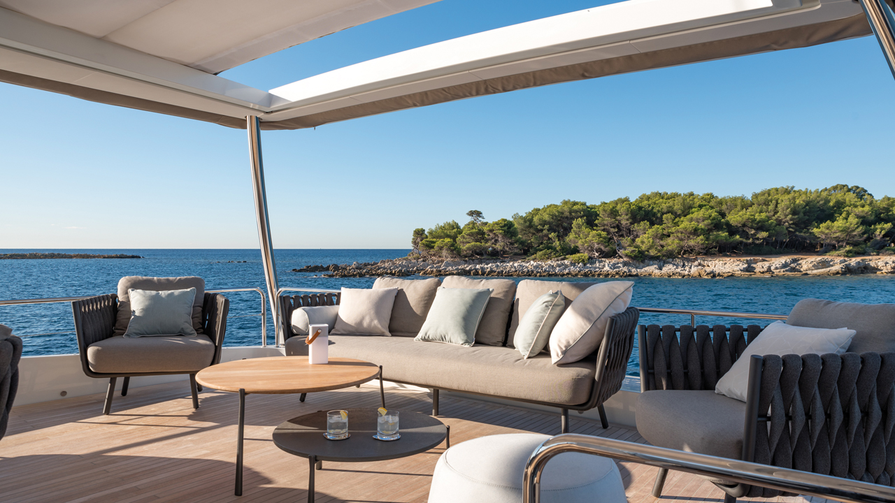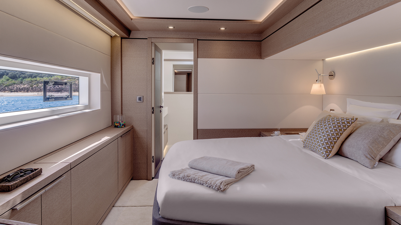 En embarquant sur le SEVENTY 8, la première impression est de monter à bord d'un bateau connu, en l'occurrence le Lagoon SEVENTY 7 auquel on aurait enlevé le mât. Mais, dès les premiers pas à bord, on découvre une unité haut de gamme bien différente. Tout d'abord, le classique trampoline avant présent sur la version voilier a disparu et est remplacé par un pont amovible couvert de teck. La plate-forme propose ainsi 250 m² sur le pont principal, avec cockpit avant et arrière de respectivement 15 et 35 m² et un salon panoramique de 70 m². On y ajoute un fly de 35 m², sur lequel un jacuzzi est aménageable. Puis, dans les coques, une cuisine de 20 m², avec quartier équipage contigu, une suite propriétaire de 25 m² avec terrasse escamotable – le must de ce bateau – et deux cabines VIP de 20 m². En tout, plus de 350 m² sont utilisables pour les espaces de vie dans un bateau s’abrogeant des lourdes contraintes réglementaires, et donc aussi financières, des unités de plus de 24 m. Bien joué !