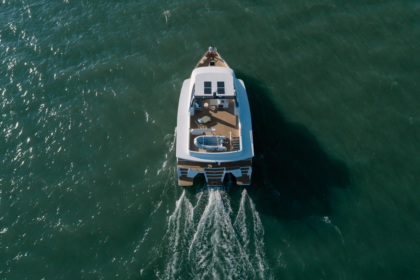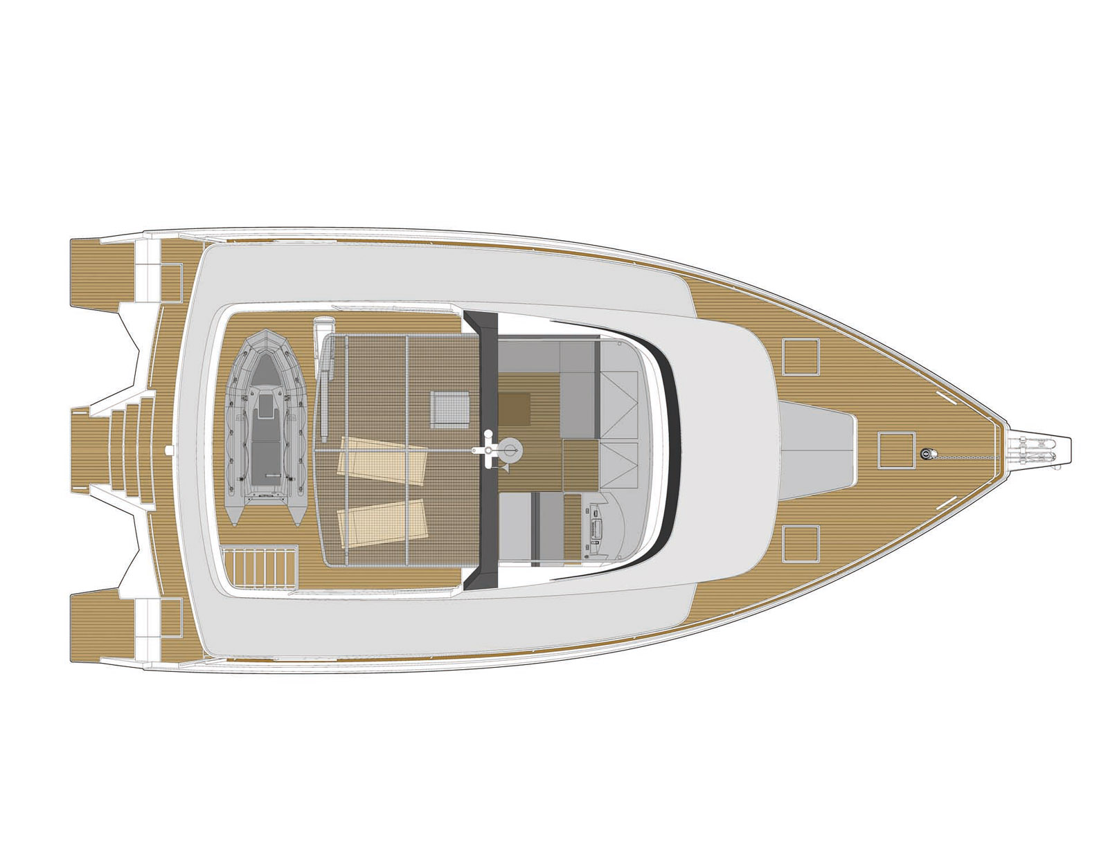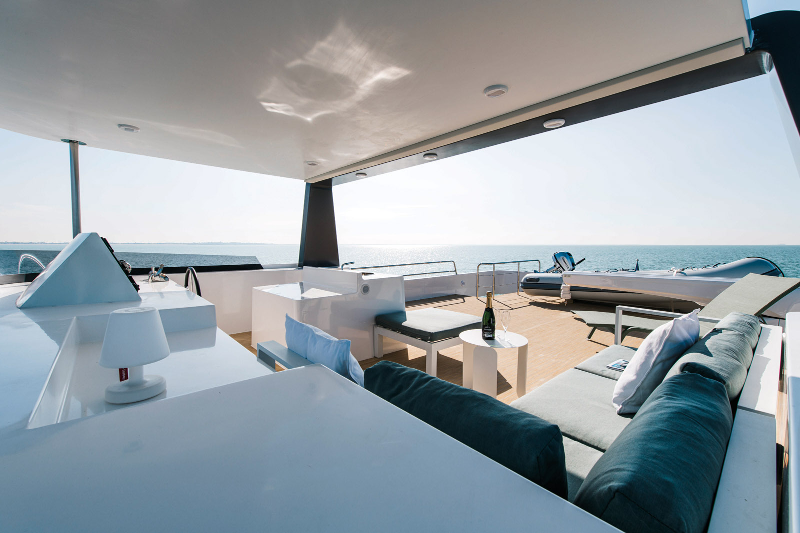 30 m2 de terrasse, voilà ce que vous propose cet immense pont supérieur équipé d’un poste de pilotage, d’une cuisine et même d’une grue pour l’annexe.