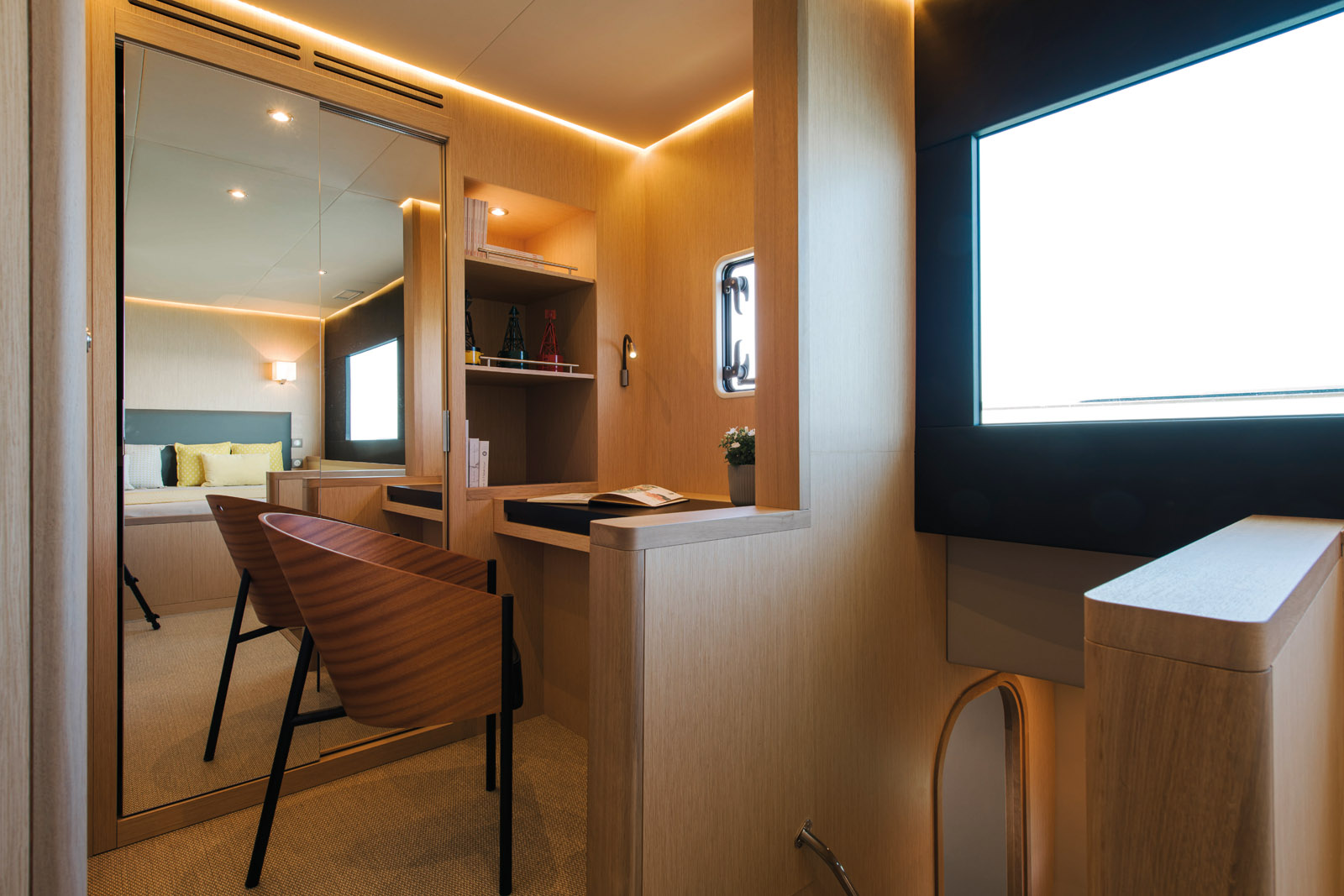 La cabine Propriétaire est de plain-pied avec la nacelle. Le volume est vaste, avec de belles vues sur mer. Un grand bureau est aménagé. Les toilettes, quant à eux, sont aménagés dans le flotteur.