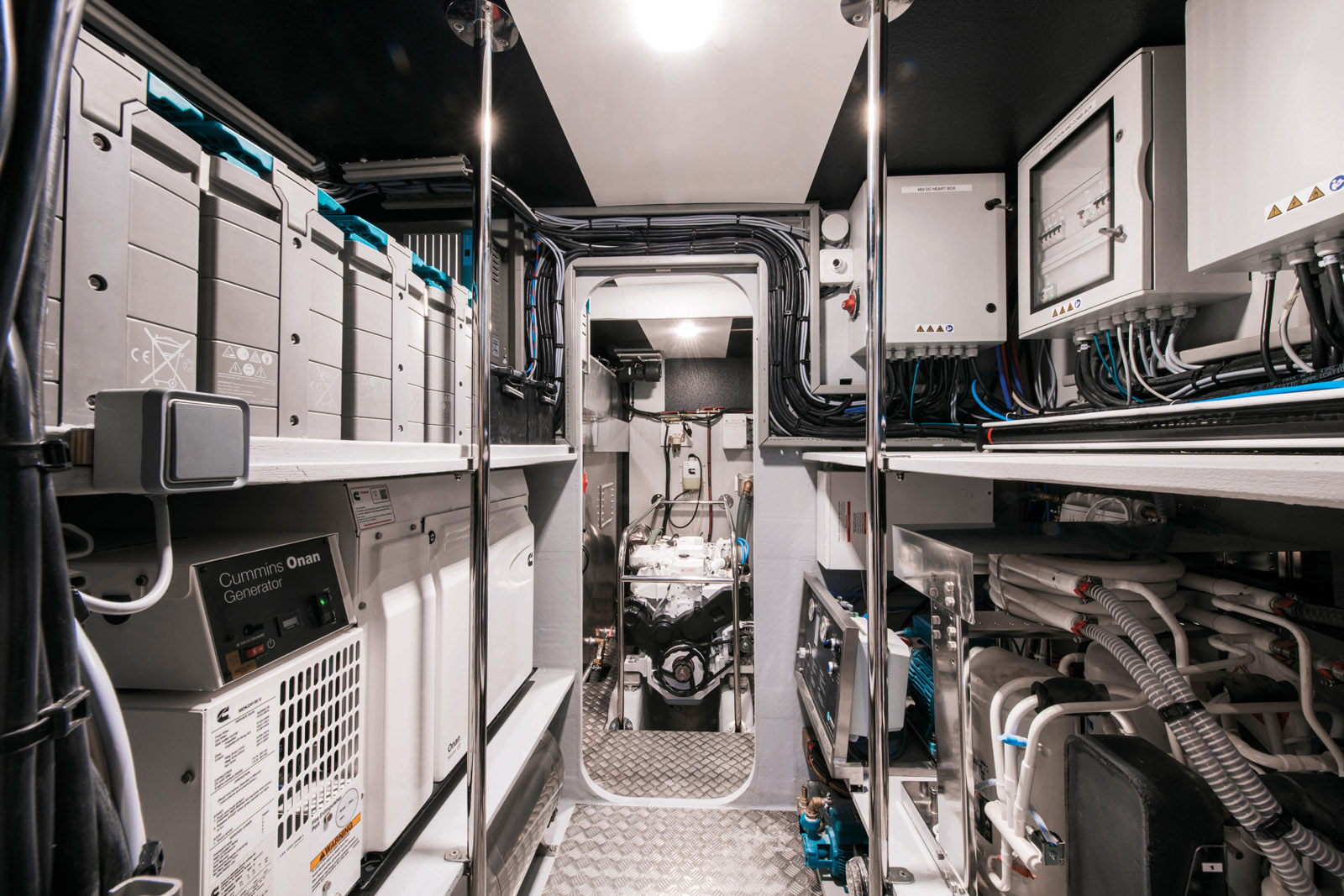 Le cœur du navire, c’est cette impressionnante salle des machines, où trônent l’imposant moteur Cummins et le parc batteries.
