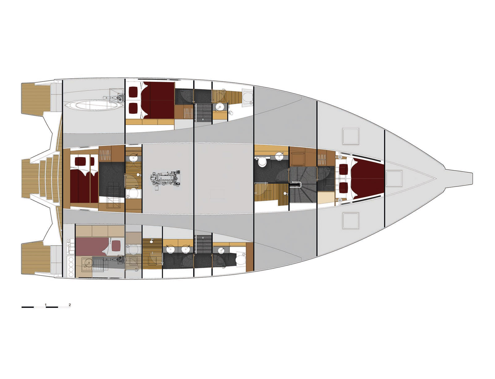 Dans la nacelle, la hauteur sous barrot est généreuse – elle oscille entre 2,08 m et 2,24 m. La table affiche exactement les mêmes cotes que sa jumelle à l’extérieur. La cuisine est agencée en U. Par comparaison avec la gamme NEEL voile, le constructeur a souhaité aller plus loin côté finitions ; à bord du 56, il y a plus de bois massif, une crédence en alu pour la cuisine, du vitrage en verre Securit pour la timonerie… Cette dernière est rehaussée de deux marches. Le poste de commande est accompagné d’un petit salon de veille – avec vue imprenable sur la route, évidemment. La hauteur sous barrot est ici de 2,07 m. A l’instar des NEEL, la cabine Propriétaire est agencée de plain-pied. On peut compter ici sur un lit de 1,80 m de largeur à la tête (1,30 m aux pieds). La hauteur sous barrot est de 2,09 m. Pour les WC et le bureau, on descend dans le flotteur tribord. Une cabine invités est aménagée dans le flotteur bâbord ; nous sommes 1,70 m sous le niveau de la nacelle et les marches sont ici particulièrement raides. La hauteur sous barrot offre pratiquement deux mètres et le lit 1,50 m de large. Les ouvertures se limitent à deux minuscules hublots latéraux. A l’avant de la coque centrale, une troisième cabine double est disponible. Le constructeur propose également des couchages simples ou superposés à l’arrière de la coque centrale et du flotteur tribord. L’accès à ces cabines se fait par les panneaux de pont.
