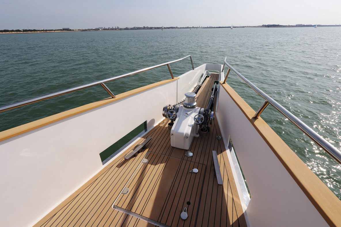 Mais avant de mettre les moteurs en route – oui, il y en a plusieurs, vous verrez -, établissons un premier contact avec le nouveau navire amiral de la flotte LEEN. Certes, le franc bord est impressionnant, on ne mesure pas moins 2,80 m de la ligne de flottaison à la main-courante du bordé. Mais par rapport au LEEN 56 qui a inauguré la gamme, les 21,80 m de longueur amènent un peu de fluidité dans les lignes de cet imposant trawler. Ce 72 pieds reprend pourtant bien des codes de cette famille de bateaux moteur initiée outre-Atlantique, destinés à la croisière et à la vie à bord. On pense bien sûr à la marque Grand Banks qui les a popularisés, même si dans le cas du LEEN, les références sont plus à chercher du côté des modèles hauturiers, voire d’expédition, du type Nordhavn, Selene ou encore Kadey Krogen, et même peut-être les atypiques FPB de Steve et Linda Dashew. Comme sur les premiers, on retrouve le pont avant bien défendu, des passavants couverts – ils sont aussi très inclinés (5 degrés) pour évacuer rapidement l’eau qui réussirait à les envahir dans de la très grosse mer -, des garde-corps sécurisants car pleins et hauts (90 cm au minimum) ou encore un vitrage du poste de navigation inversé pour éviter les reflets et offrir une vision parfaite dans toutes les conditions. Mais ces marqueurs historiques ne sont pas associés à un monocoque à déplacement qui pousse beaucoup d’eau et ne demande qu’à rouler comme un pendule sur la houle ou à l’ancre. Non, ils sont associés aux carènes d’un multicoque moderne, dont la coque centrale fend littéralement l’eau et dont les flotteurs assurent une stabilité incomparable, en navigation comme au mouillage. Nul besoin ici d’un complexe, coûteux et lourd système de stabilisation à ailerons ou gyroscopique : le multicoque prouve une fois encore toute la pertinence de son architecture multimillénaire.