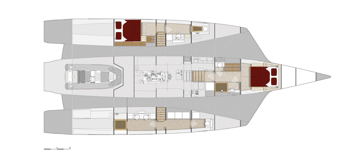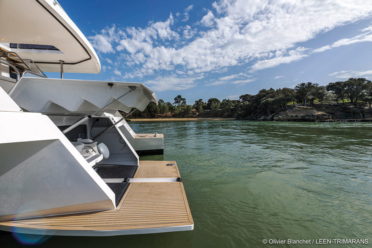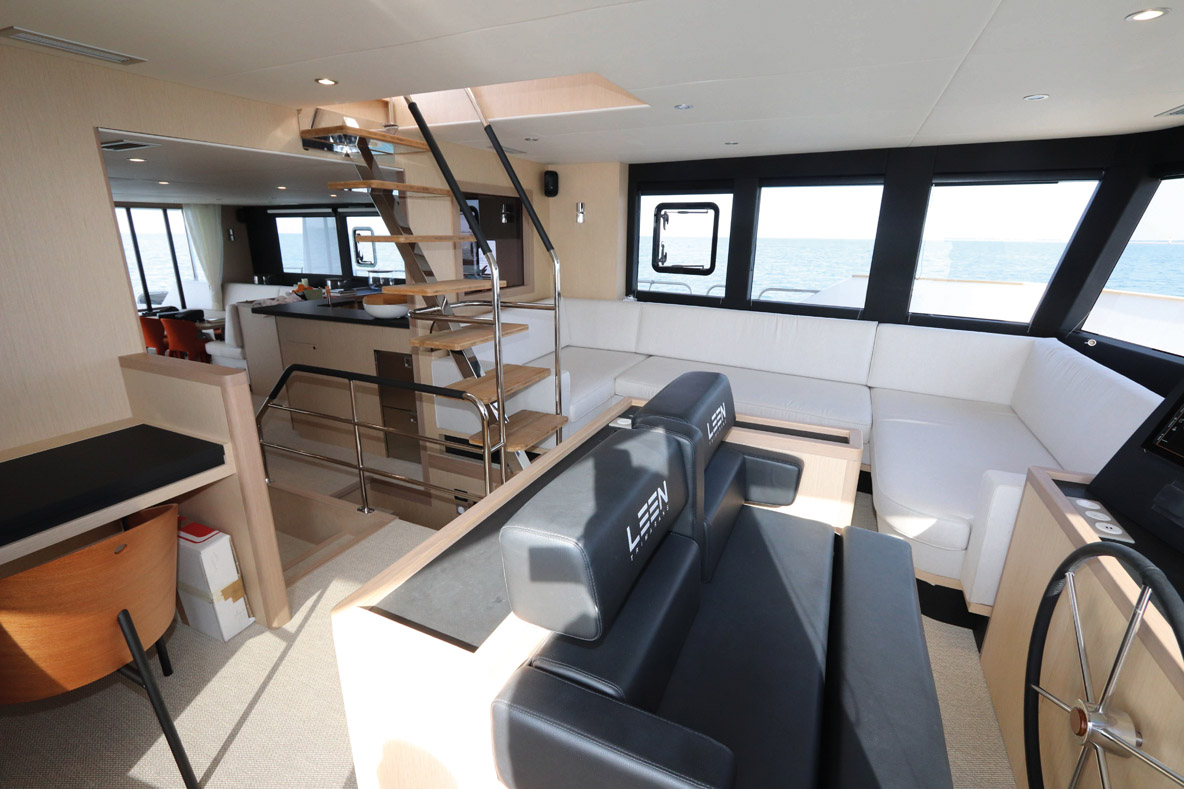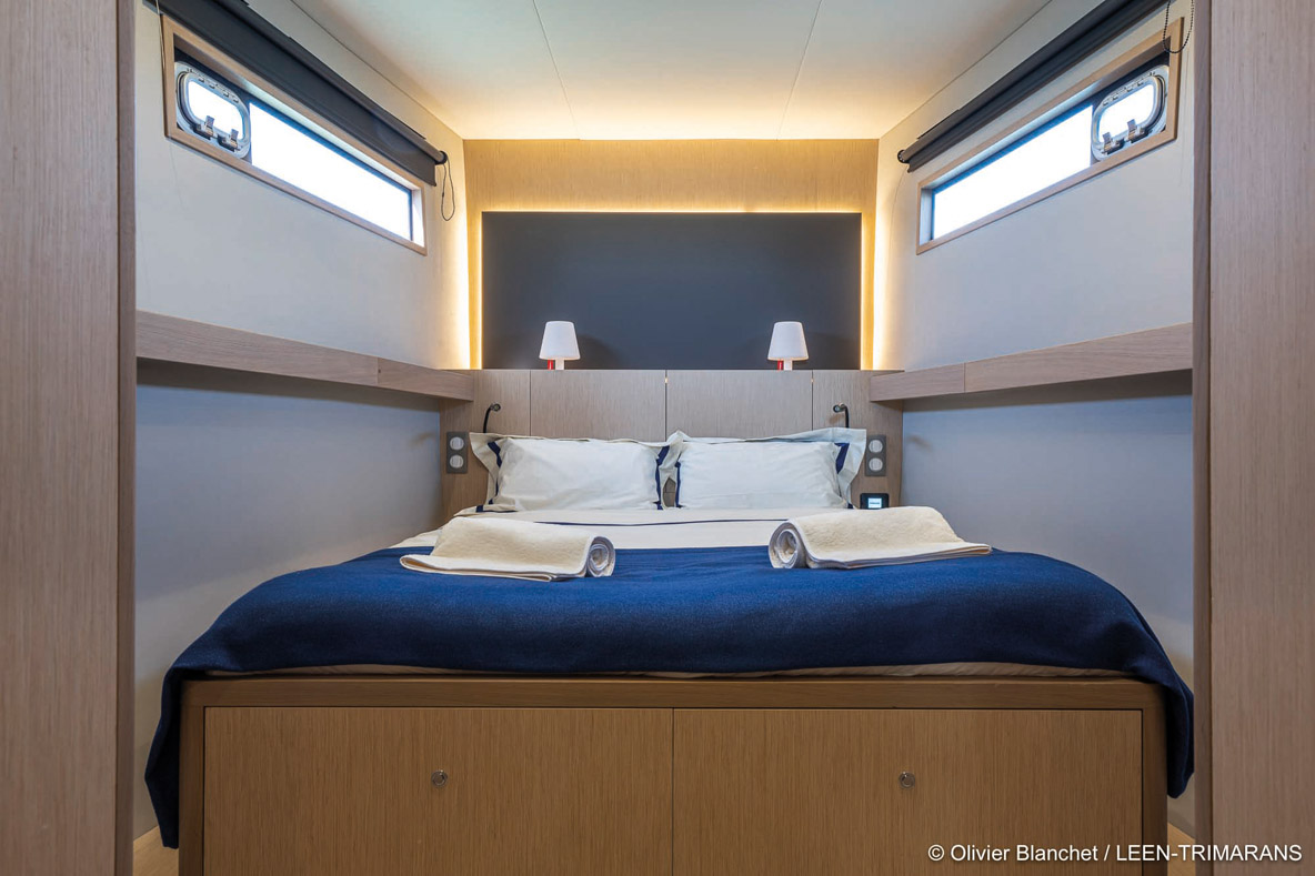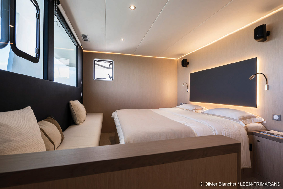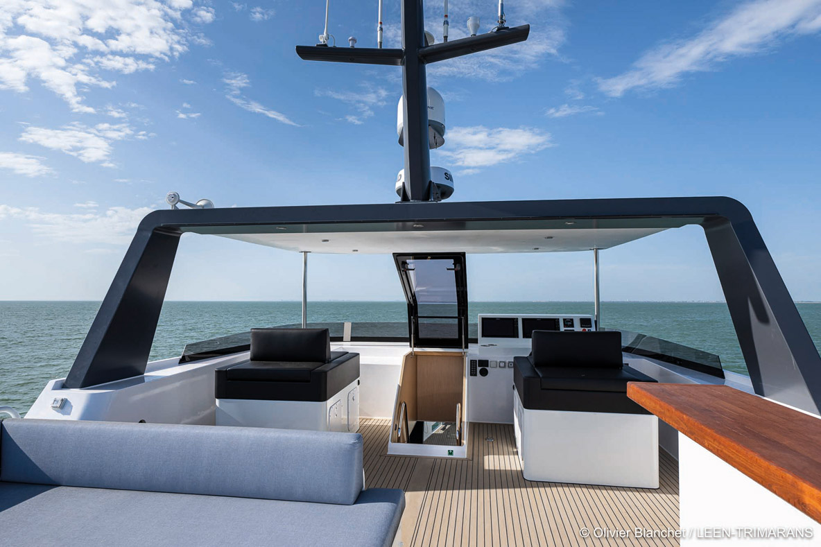 L’ambiance très cosy-yachting du bord ravira les amateurs de latitudes septentrionales – et donc plutôt fraîches. Le propriétaire de cette unité inaugurale est de ces aficionados des hautes latitudes : en mer comme en montagne, il aime ouvrir la voie sur des zones non cartographiées de préférence. Le faible niveau sonore participe également au confort du bord, lequel tranche avec l’aspect plus rustique de l’extérieur. Le rendu de l’intérieur est en partie lié au mode de fabrication par panneaux plans mis en forme, sans moules. Ce niveau de finition sied très bien aux routes visées, hors des sentiers battus. Si le programme est plus méditerranéen que patagonien, une finition laquée est toujours possible - mais les aménagements eux, n’auront pas besoin d’être surclassés. Ils sont signés Pierre Frutschi et restent dans l’esprit maison - à la fois lumineux, contemporains et marins. Quand la large baie vitrée (2,75 m) est ouverte, la table du carré pour 8 personnes peut être prolongée par celle du cockpit, ce qui en double sa capacité. Mais au quotidien, le LEEN 72 est proposé en 3 ou 4 cabines - il n’y a alors pas de garage à annexe possible. Quant aux repas, ils seront donc pris soit à l’extérieur soit en indoor. Notez au passage qu’une cabine marin peut être intégrée dans un flotteur. En progressant vers l’avant, on découvre une très belle cuisine en U recouverte d’un joli corian marbré. De nombreux rangements sont prévus, tout comme un important volume froid adapté aux longues croisières sur tribord. Pour préserver la vue et la lumière, cette cuisine est astucieusement séparée par un grand vitrage de la partie avant de la nacelle. A bâbord de l’escalier qui mène au flybridge, on découvre un large salon. De quoi converser avec le pilote qui dispose quant à lui d’une confortable banquette sur tribord - face à la barre bien sûr -, de tous ses instruments et d’une vue à 180 degrés. Le pare-brise en verre Sécurit avec lave-glace et système de dégivrage confirme, s’il en était encore besoin, la vocation toutes mers du navire. L’accès latéral direct au passavant tribord est d’un confort et d’une sécurité plus qu’appréciables. L’utilité du petit bureau dos à la route, dont on note au passage le design séduisant du siège, est en revanche moins évidente. Est-ce que ce volume n’aurait pas été plus utile dans la cabine propriétaire à laquelle il est adossé ? Cette vaste suite de plain-pied dans la nacelle est précisément l’un des points forts de ce LEEN 72. Depuis le lit (180 x 200 cm), la vue sur l’extérieur via un vitrage XXL de 2,50 mètres de long sur 80 centimètres de haut, vous fait voir la mer en mode cinémascope. Si le grand dressing est au même niveau, il faut descendre dans le flotteur pour accéder à la salle d’eau qui, en contrepartie, se déploie sur une grande longueur, entre WC d’un côté, double vasque et douche à l’italienne de l’autre. Quant aux deux cabines invités, l’une occupe l’avant de la coque centrale, l’autre le flotteur bâbord. Elles disposent chacune de leur salle d’eau indépendante, mais dans la première, le WC est séparé et accessible sans passer par la cabine - ce qui en fera des toilettes de jour très pratiques. A l’extérieur, la grande plage avant, dos à la timonerie, est un lieu assez unique, très prisé des invités par beau temps. Un double guindeau de 2 300 W en 24 V occupe la robuste delphinière. Au mouillage, on occupera volontiers l’immense flybridge accessible soit depuis le cockpit, soit directement depuis la timonerie intérieure. Il est bien sûr possible de piloter à l’abri sous le bimini rigide. Le pilote restera ainsi au contact de son équipage qui profitera de la longue cuisine d’extérieur, du carré avec vue à 360 degrés ou encore des bains de soleil qui occupent l’arrière-bâbord.