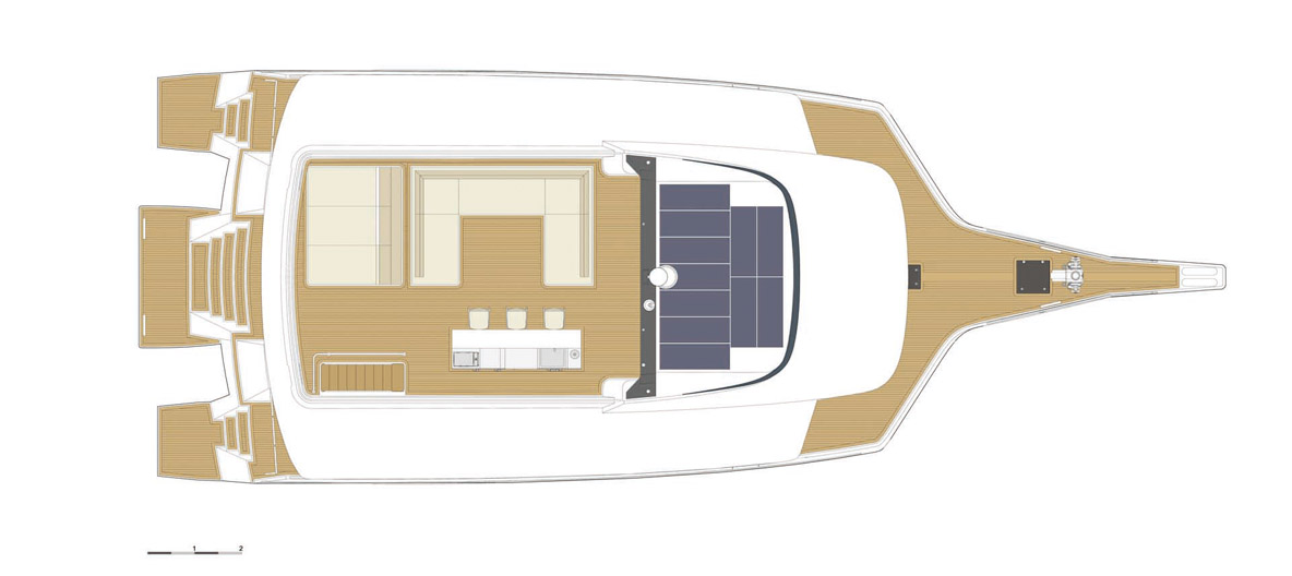 A l’issue de la démonstration d’entrée/sortie de l’annexe semi- rigide de 4,10m qui disparait complètement - et sans effort qui plus est grâce au treuil électrique - dans son garage à l’arrière de la coque centrale, on monte à bord. L’opération est relativement aisée depuis le ponton vers les jupes relativement hautes des flotteurs. Celle de la coque centrale, presque au ras de l’eau, formera une vaste plage de bain, bien agréable au mouillage. Au vu de l’étroitesse du passage entre les pontons, du trafic dense d’un joli samedi de mai dans le port des Minimes et des travaux de dragage en cours, il pourrait paraître compliqué de s’extraire de notre place. Il n’en est rien. Cette sortie est l’une des toutes premières de ce powertri et pourtant Eric Bruneel semble plus zen que jamais aux commandes. Il faut dire qu’il en a quatre à sa disposition pour positionner au millimètre cet imposant navire dont les dimensions (21,80 m par 8,85 m) sont proches de celles d’un court de tennis. Outre le moteur principal Cummins de 400 CV sur lequel nous reviendrons en détail une fois en mer, chaque flotteur est équipé d’un moteur électrique de 15 kW à la réactivité immédiate. Ces deux moteurs, inversés, sont susceptibles de faire tourner le bateau autour de son axe, comme un catamaran. Enfin, pour parer à toute éventualité, et notamment celle d’un fort vent latéral sur des superstructures conséquentes, un propulseur d’étrave (15 kW en 24 V) est également installé. Alors on s’extraie du catway en toute tranquillité, rassurés dans les phases les plus critiques par les images renvoyées par les quatre caméras (bordés et jupes des flotteurs). L’affichage sur l’écran du poste de navigation mériterait quand même un petit développement de la part du fournisseur d’électronique afin d’offrir une lecture plus intuitive, de type « Bird View », comme dans l’automobile. En effet, si tribord et bâbord sont bien respectés sur l’écran, l’avant et l’arrière semblent inversés et les deux flotteurs se font face - là où on imaginerait plus volontiers la coque centrale ! Certes, le Capitaine s’habituera rapidement à ce type de manœuvres même si entrer et sortir de sa place un multicoque de ce gabarit reste toujours un moment délicat, même quand il fait aussi beau que lors de notre essai. Dans tous les cas, autant optimiser la technologie disponible pour éviter le moindre doute.