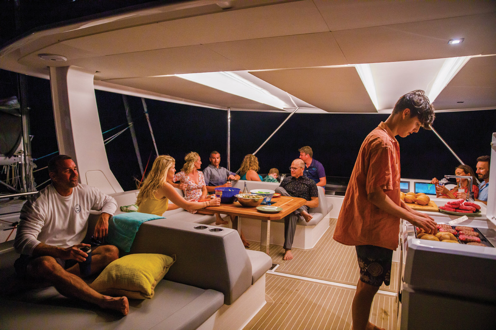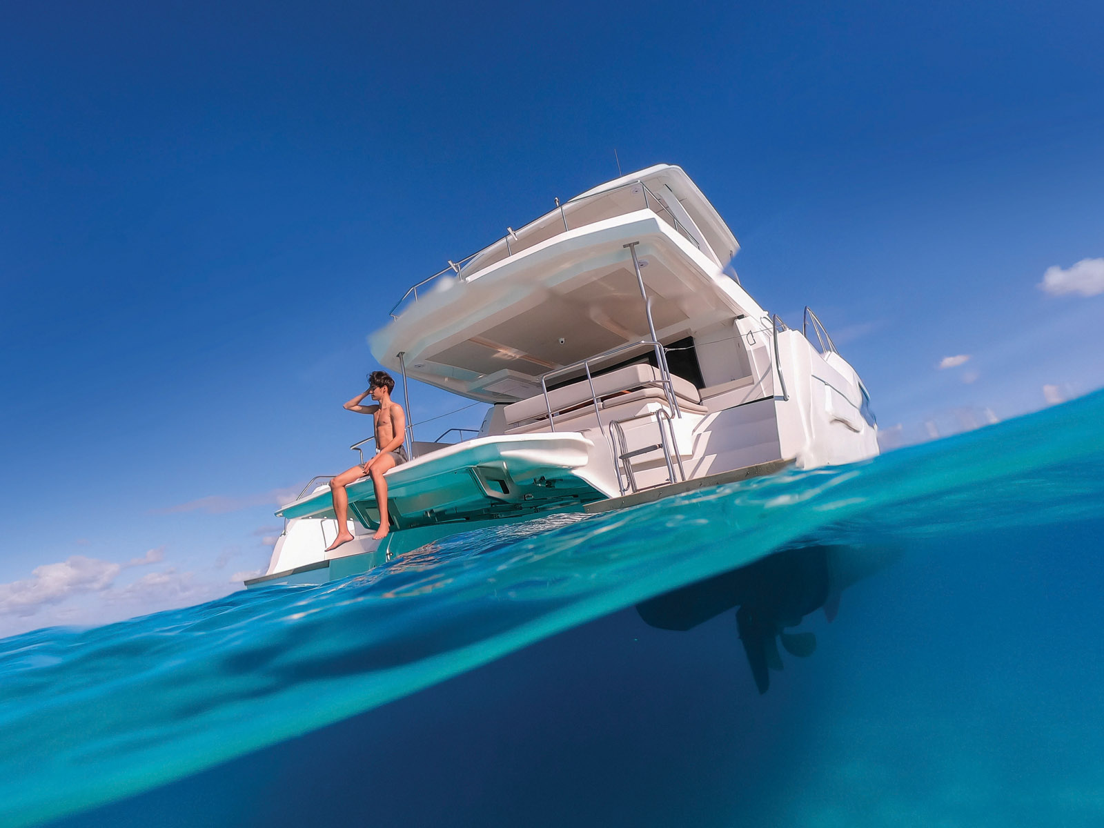 Le cockpit est largement protégé par le bimini rigide. La surface de pont est dégagée – presque trop avec la petite table de cockpit triangulaire. Avec un équipage nombreux ou pour recevoir, on optera pour la grande table – en polyester ou en teck – proposée en option. Les assises sont néanmoins nombreuses, et l’accès à la mer privilégié grâce aux amples jupes arrière et à la plate-forme hydraulique. Un escalier doté de larges marches mène à l’impressionnant flybridge. On y découvre un vaste bain de soleil, une banquette et sa table en U pour 8 personnes, un module cuisine/ bar et bien sûr le poste de pilotage, complété par une grande banquette pour deux personnes. Tout le pont est sécurisé par un robuste bastingage en inox. Depuis le cockpit arrière, quelques marches donnent accès aux passavants, larges et bien dégagés. A l’avant, pas de trampolines mais un pontage en dur. Il abrite le guideau et sa chaîne, deux imposants volumes de rangement (transformables en cabine et toilettes skipper) et un coffre pour les bouteilles de gaz. On peut profiter ici de deux grands bains de soleil dotés de dossiers relevables.