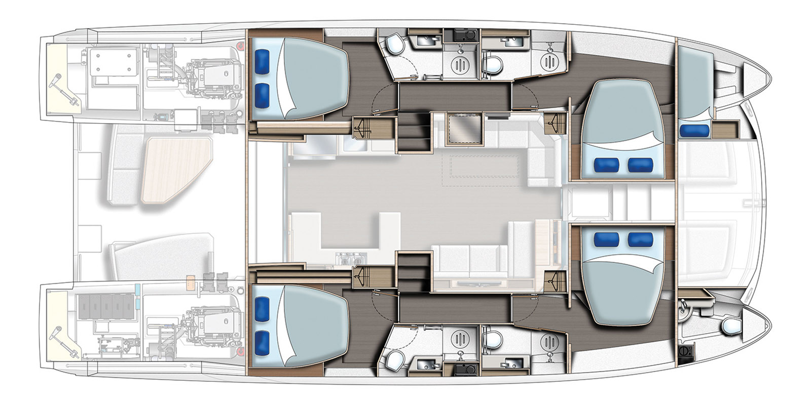 L’entrée dans la nacelle s’effectue évidemment de plain-pied ; les baies vitrées offrent une large ouverture. L’impression de volume est saisissante – en grande partie grâce à la hauteur sous barrot, largement supérieure à deux mètres. Le constructeur annonce un gain de 31 %, pas moins ! Les vitrages de grande taille offrent une vue panoramique imprenable. Le constructeur a opté pour une cuisine proche du cockpit arrière avec un module en U sur tribord avec cuisinière quatre feux, four, micro-ondes et rangements (présents également sous les planchers). Sur bâbord, un second module intègre un évier et un imposant réfrigérateur à double ouverture. L’avant de la nacelle est occupé par un immense salon avec des assises sur chaque bord – côté bâbord, les banquettes forment un L autour de la table basse, laquelle peut être remplacée par un plateau repliable plus grand. Tout à l’avant tribord, un poste de barre est aménagé en option. La visibilité, au travers des vitrages, est excellente. En standard, on dispose tout de même de la double assise et d’une table à cartes. Au centre, la fameuse porte avant étanche chère à Leopard offre un accès direct à la plage avant. Cette configuration révolutionne la circulation à bord – plus besoin d’emprunter les passavants extérieurs pour rejoindre les apparaux de mouillage ou d’amarrage, par exemple. Les coques proposent trois ou quatre cabines ; la première version installe le propriétaire dans la coque tribord – elle s’isole de la nacelle par une porte coulissante. Sans surprise, le lit double est à l’arrière, le bureau et son canapé dans la coursive, tandis que la salle de bains – équipée de deux vasques – est aménagée dans la pointe avant. On constate ici encore le niveau de finition, supérieur aux modèles Leopard les plus récents. Eclairages indirects, précision des ajustements, qualités des matériaux : c’est du beau travail. Pour ne rien gâter, rien ne flirte avec le gadget de pacotille : le chantier a une bien trop longue expérience avec l’univers de la location pour se laisser tenter. Ici, tout est solide et bien pensé. La coque bâbord abrite deux cabines, bien sûr moins luxueuses, mais néanmoins très confortables, riches en rangements, bien aérées et éclairées. Le lit avant queen size est installé en travers. La coursive abrite le tableau électrique – possibilité d’installer un lave-linge – et deux salles de bains. A noter : chaque lit offre une large vue sur mer.