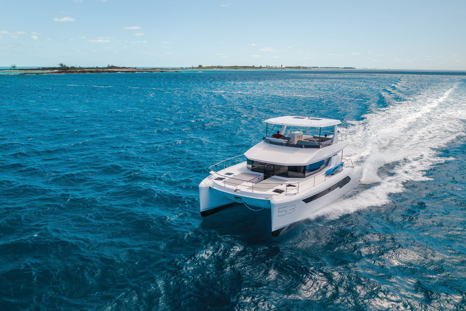 C’est au Miami Boat Show que le Leopard 53 PC a eu droit à sa première mondiale ; un bon choix si on en juge par le carnet de commandes – six exemplaires vendus ! Le marché du catamaran à moteur deviendrait-il la nouvelle niche à investir ? C’est en tout cas le choix de nombreux constructeurs de multicoques. Pour Robertson & Caine, ça ne date pas d’hier, puisque les premiers powercats ont été lancés dans les années 1990. Le succès est mitigé – à tel point qu’en 2002, Leopard Catamarans n’y croit pas vraiment avec ses Lion 43 et 46. Les affaires s’engagent un peu mieux pour le Leopard Cat 47, proche du 46 à voile. L’arrière des coques est redessiné et les quillons raccourcis. Même opération pour le 39 PC, déclinaison du 39. Pour les modèles suivants, le 51 et le 43 PC, les architectes empruntent un outillage commun aux versions voile correspondantes, mais adoptent des coques – et donc des carènes – spécifiques. Ces deux derniers modèles connaissent un véritable engouement : 120 exemplaires à ce jour pour le 43 PC et 137 pour le 51 PC – ce dernier modèle, à ce jour, pourrait bien être le powercat le plus diffusé au monde. Notre tout nouveau 53 PC proposé à l’essai est donc son remplaçant – grosse pression.