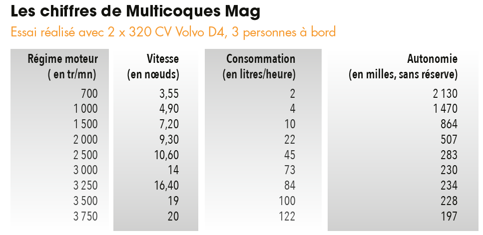 Prix du powercat essayé : 1 421 627 € HT, avec finition Excellence, pack Art de vivre, pack électronique, pack Audio, kit amarrage, kit mouillage, covering de coque et de fly, toile d’ombrage pont avant, fermeture arrière du cockpit, hard top, canapé plage avant, rideaux extérieurs, prise d’eau douce de quai, chargeur smartphone, Ship Control, lampes extérieures Pop-Up, projecteur de pont, projecteur sous-marin, four micro-ondes gril, ice maker, plaque induction, climatisation tropicale, plan de travail noir, moquette, kit docking, préinstallation TV dans cabine avant, lecteur et hp Fusion, TV Led, stores vénitiens en bois, teck synthétique, parquet chêne brossé blanchi.