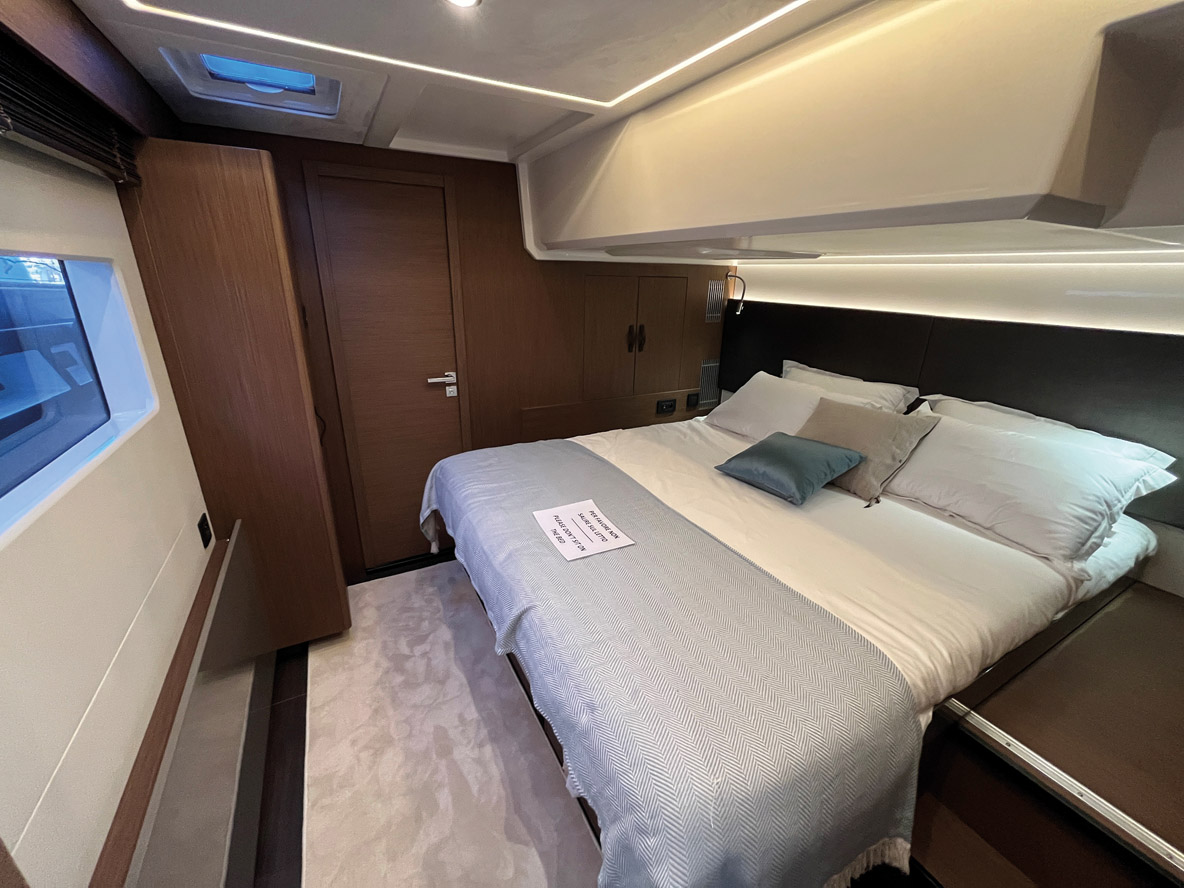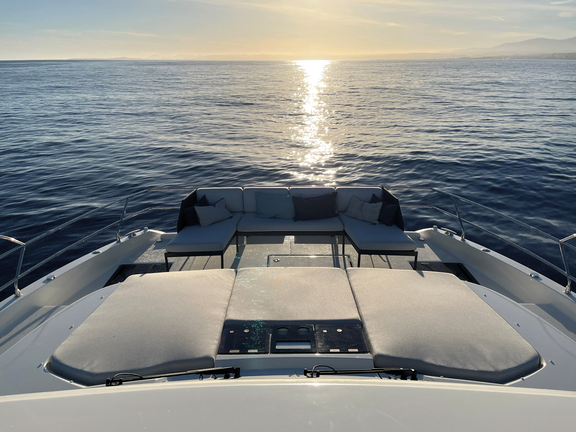 Vu la hauteur du franc-bord, l’accès à bord s’effectue par une des deux jupes arrière ou via la grande plate-forme hydraulique. Dans l’imposant tableau arrière se cache une véritable soute aussi imposante qu’inhabituelle. Un bastingage pivotant – il suffit de le soulever pour le libérer – effectue un quart de tour pour sécuriser la zone lors des navigations. Dès les premiers pas à bord du M48, on est surpris par le niveau de finition. Les matériaux, pour commencer, sont tous qualitatifs. Les assemblages sont irréprochables, et partout les cinétiques des éléments mobiles sont bien pensés. On sent tout de suite que le constructeur est à son affaire à l’heure de la conception des aménagements. Produire plus de 300 vedettes haut de gamme de 40 à 70 pieds par an y est certainement pour quelque chose. Restons encore sur le pont avant de découvrir l’intérieur. Les passavants, malgré la relative étroitesse du powercat, affichent toujours une largeur supérieure à 40 cm. La marche vers l’avant n’est pas gênante. Un pavois dont la hauteur oscille entre 15 et 25 cm assure une bonne protection lors des déplacements, d’autant que le bastingage est costaud et les mains courantes partout présentes. Côté tribord, une porte de coupée assure un accès direct à l’intérieur. L’ouverture est petite (106 x 54 cm), ce qui oblige à se plier un peu en deux pour passer, mais elle a le mérite d’exister. La plage avant est dédiée au farniente, avec un vaste bain de soleil et un canapé, installé à poste fixe tout à l’avant. L’assise est évidemment particulièrement exposée en navigation et génère un fardage non négligeable – il s’agit d’une option dont on peut, selon nous, se passer. Le pontage avant recèle également des rangements – ils sont très nombreux à bord – et deux accès tout à l’avant de chaque coque. On peut installer ici une cabine skipper et une salle d’eau.