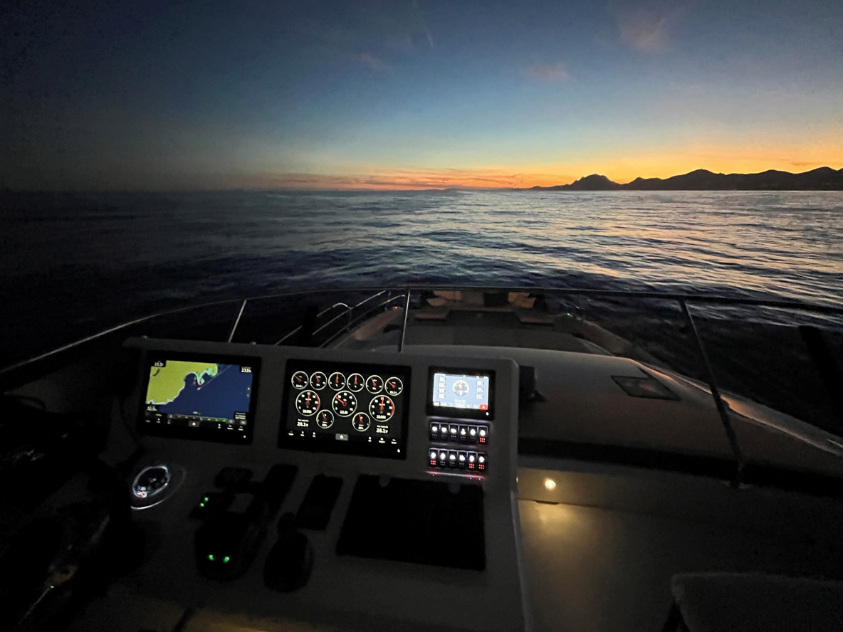 Nous déposons Andréa Cragnotti, responsable des ventes Europe, au port de Saint-Laurent-du-Var pour qu’il puisse prendre son avion à l’aéroport de Nice tout proche. La température particulièrement douce de ce début d’automne nous impose juste, au soleil couchant, d’enfiler une veste pour rester sur le flybridge. Les rochers des îles de Lérins et bien plus loin le cap Dramont disparaissent progressivement, remplacés progressivement par les lumières des villes côtières. Les feux vert et rouge de Port-Fréjus sont bien timides, mais ils indiquent bien la chicane des enrochements à emprunter. Je prends les commandes pour nous garer cul à quai : même pas besoin de l’assistance du Ship Control ! C’est tellement facile, le catamaran !