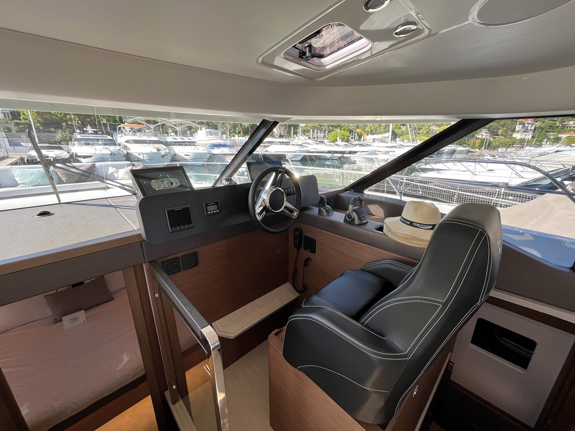 La transition cockpit/nacelle est parfaitement gérée par un accès de plain-pied et une ouverture de 1,93 m de hauteur par 0,76 de large. Un panneau coulissant permet d’obtenir 78 cm supplémentaire. Le carré à tribord propose l’accueil de six personnes avec sa banquette en U et sa table de 150 x 68 cm. En face, la cuisine en U est complètement à l’écart du passage. La hauteur sous barrot, dans toute la nacelle, frise les 2 mètres. La lumière naturelle est abondante et la vue sur la mer imprenable – debout comme assis. Malgré sa largeur modeste, cette zone de vie est très bien traitée, tant sur le plan de l’ergonomie que de celui de la qualité. Comme à l’extérieur, on constate avec évidence le luxe offert par la Prestige M48. La timonerie intérieure présente un confortable fauteuil – juste un peu éloigné du tableau de bord, un détail facile à régler – et toutes les commandes utiles pour manœuvrer le M48 bien à l’abri.