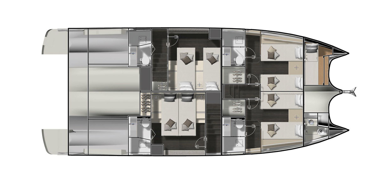 La cabine avant dédiée au Propriétaire est également une illustration du savoir-faire du constructeur. Il suffit de descendre trois marches et demie pour accéder à un volume immense qui s’étend dans toute la largeur disponible, avec une hauteur sous barrot de 1,95 m. Le lit king-size est placé au centre ; à bâbord, on profite d’un canapé de 1,62 m. En face, on trouve un grand bureau de 2,05 x 0,50 m. Quatre panneaux ouvrants sont en place. Depuis la nacelle, sept marches plus bas, on accède sur chaque bord aux cabines dans les coques. A bâbord, deux lits simples sont convertibles en un seul double. Dans l’autre coque, on dispose d’un grand lit double de 1,75 x 2 m. Chaque cabine dispose d’un cabinet de toilette complet, et bien sûr d’une belle vue sur l’eau. Des « chambres » dignes de celles d’un hôtel, rien à redire sinon un seul bémol : l’aération naturelle est ici un peu négligée, surtout à tribord, où l’on ne dispose que d’une seule ouverture.