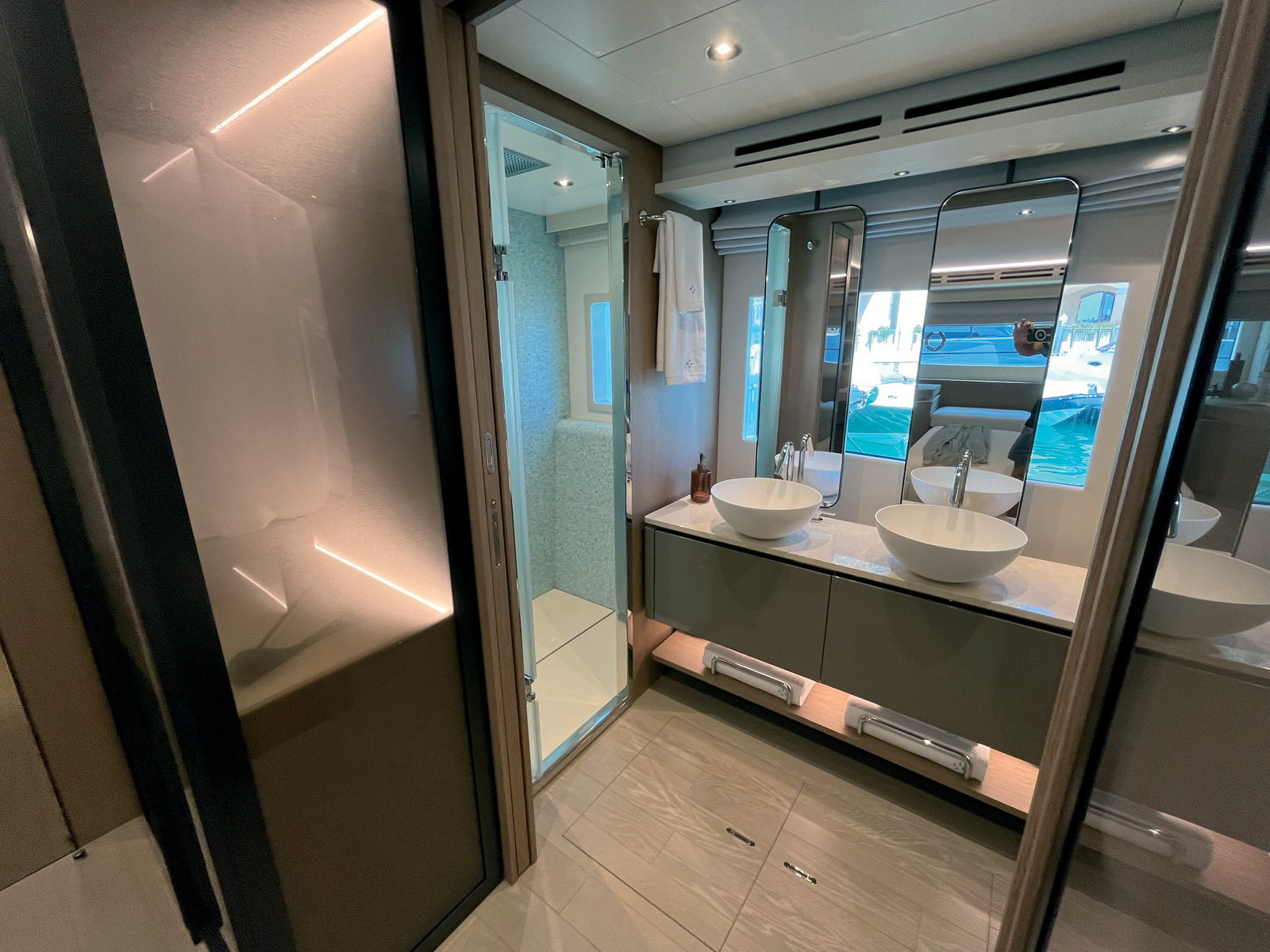 Le cabinet de design Garroni a la réputation de créer partout, tels des magiciens, des centimètres, voire des mètres carrés dans chaque nouveau modèle sans agrandir la longueur des coques, mais aussi de créer la surprise avec une organisation des espaces de vie qui ne craint pas d’être, parfois, radicalement innovante. Le tout en conservant un certain classicisme en termes de design extérieur – un sacré tour de force ! On se souvient, entre autres, de la descente privative vers la cabine Propriétaire sur la 500 et des différents ponts des modèles X. Revenons à bord de la gamme M-Line : plus récemment, c’est la cage d’escalier façon super-yacht du M8 qui a fait sensation.