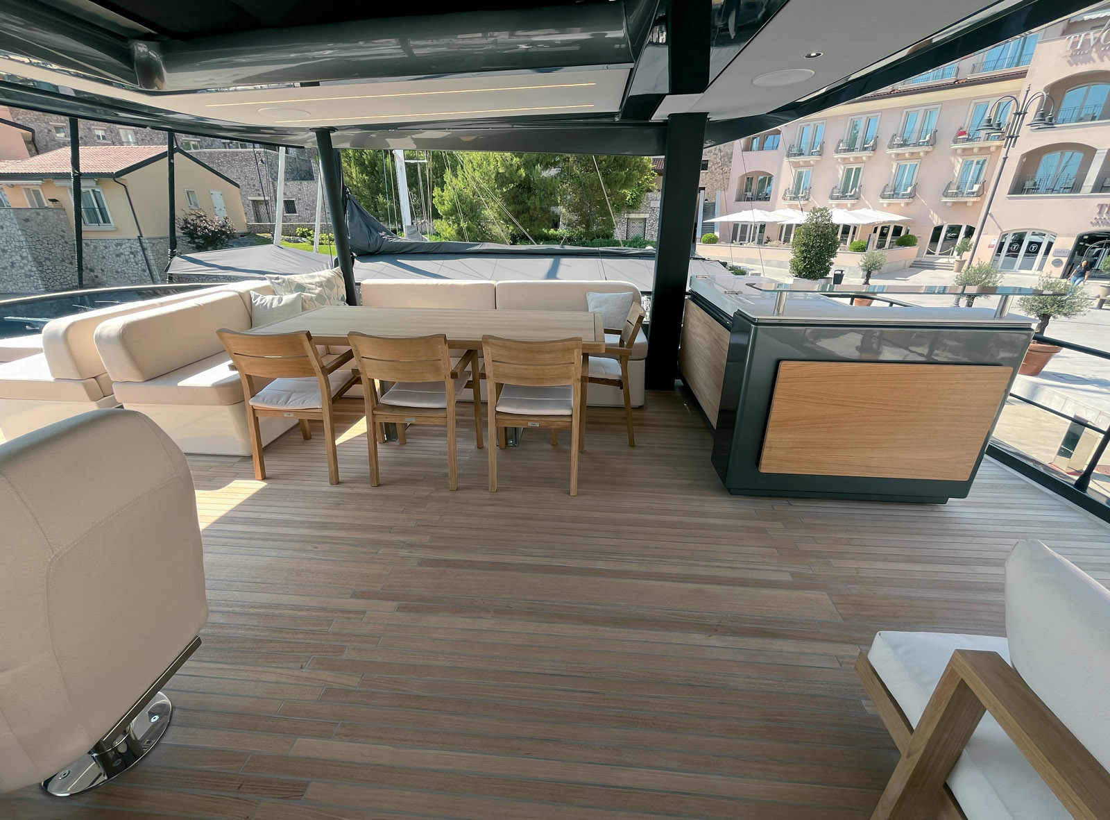 D’emblée, cela en jette d’apercevoir le Prestige M7 à flot dans l’ambiance très select de la petite marina de Porto Piccolo. On arrive par le haut de cet amphithéâtre composé de villas et de somptueux appartements ; la scène en contrebas n’est autre qu’un élégant et modeste bassin, véritable écrin pour les belles unités qui y sont amarrées. Le décor est parfaitement approprié pour le nouveau M7, un powercat qui entend bien consolider, au sein de la gamme de catamarans M-Line, la croissance de la marque Prestige Yachts dans le monde du motor yachting de luxe. L’objectif de M-Line ne s’arrête pas en effet à concurrencer les autres acteurs du secteur des grands powercats et autres multiyachts ; il s’agit également de rivaliser avec les faiseurs du segment tout entier – composé de monocoques pour la plupart, il faut bien le dire.