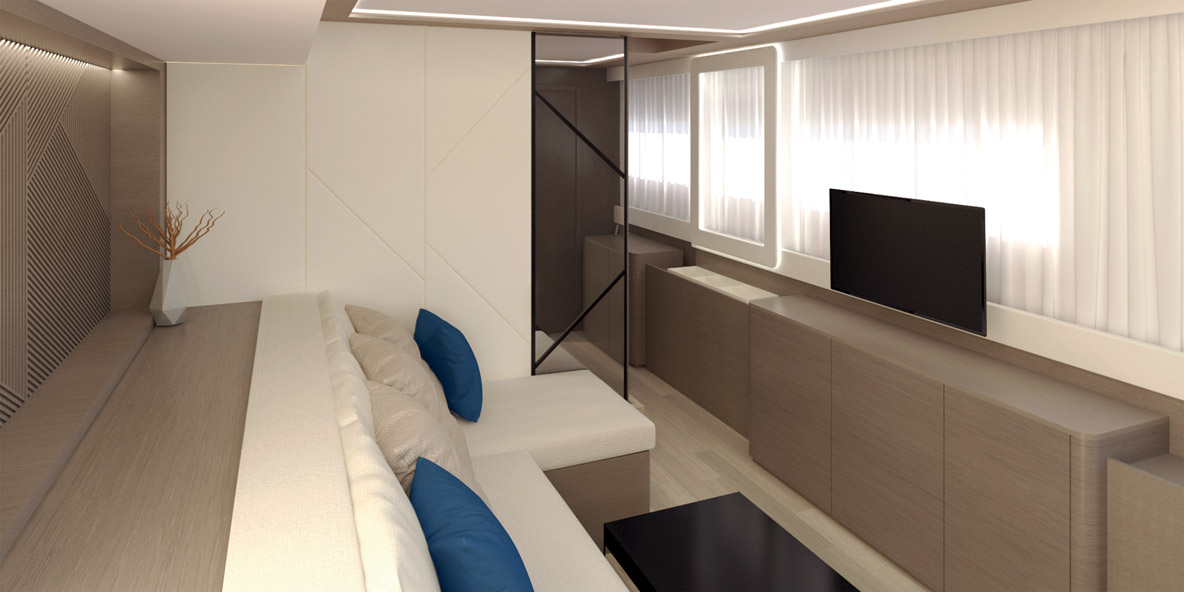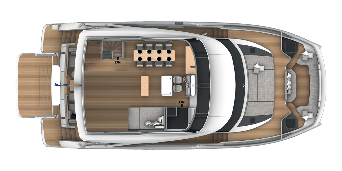 Là, le design est bien sûr à l’œuvre, avec un haut franc-bord qui rappelle les tendances actuelles en cours dans le yachting monocoque. A bord de la M8, le pont avant rehaussé a pour particularité d’être en mesure d’accueillir la suite Propriétaire en avant du salon, de plain-pied. Quant à la silhouette générale, elle reste profilée et fidèle à l’ADN Prestige Yachts : la casquette du flybridge est discrète, tandis que la ligne de coque légèrement en fuite jusqu’à la poupe et l’intégration des superstructures derrière le pavois apportent un rien de sportivité.