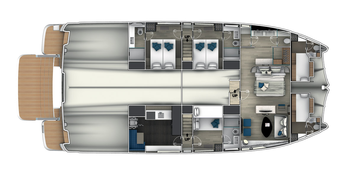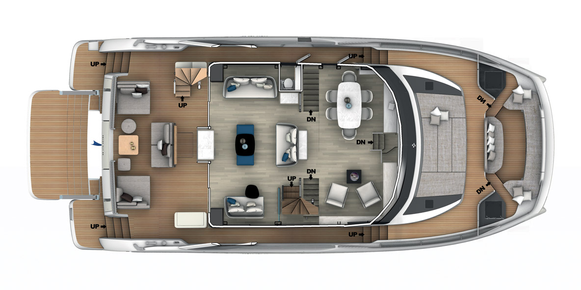 Tout autant que le volume et les équipements, la distribution, le mobilier et la décoration sont des éléments incontournables du grand luxe sur l’eau. Ainsi, quelques particularités que l’on retrouve sur les grands yachts confirment la réussite du chantier. L’immense salon de pont se divise en plusieurs zones : lounge, salle à manger, cuisine ouverte ou salon se répartissent autour d’une cage d’escalier qui dessert, en bas, les cabines inférieures (ou le quartier équipage avec sa cuisine si celle-ci est placée dans la coque).