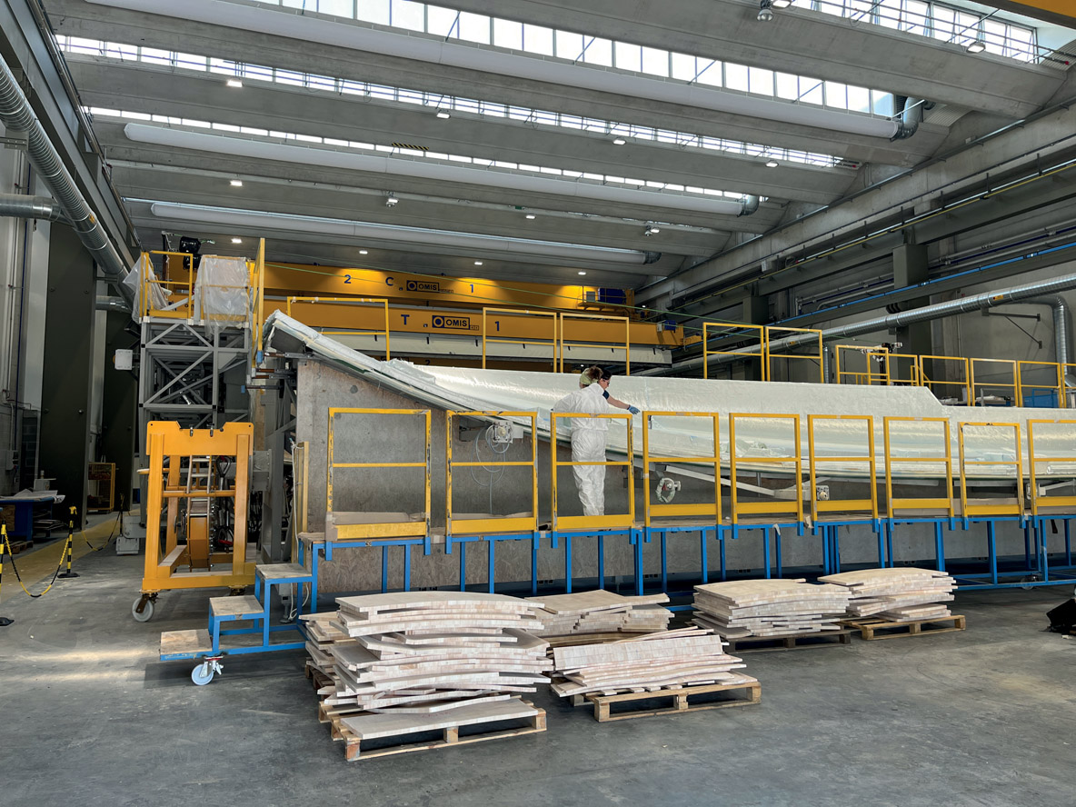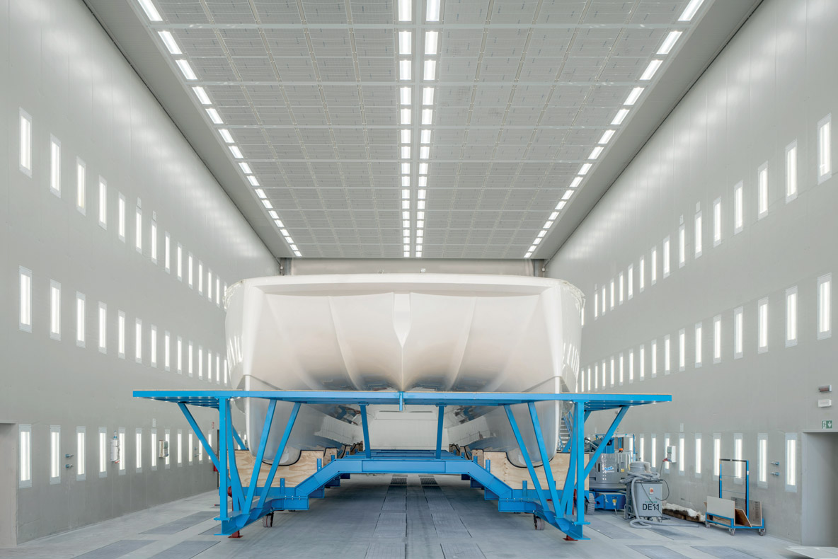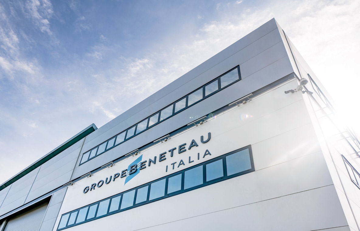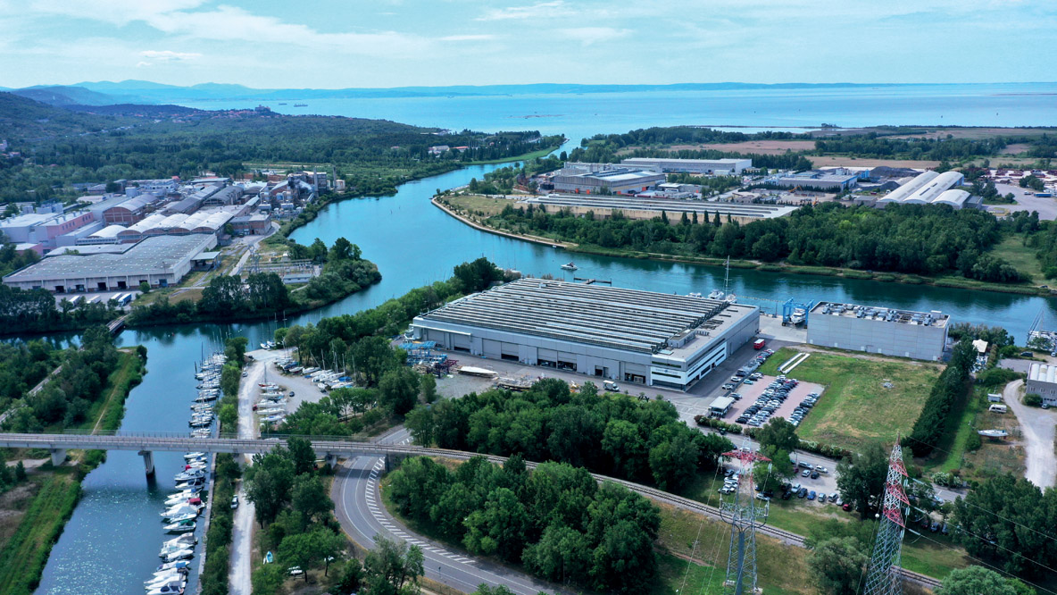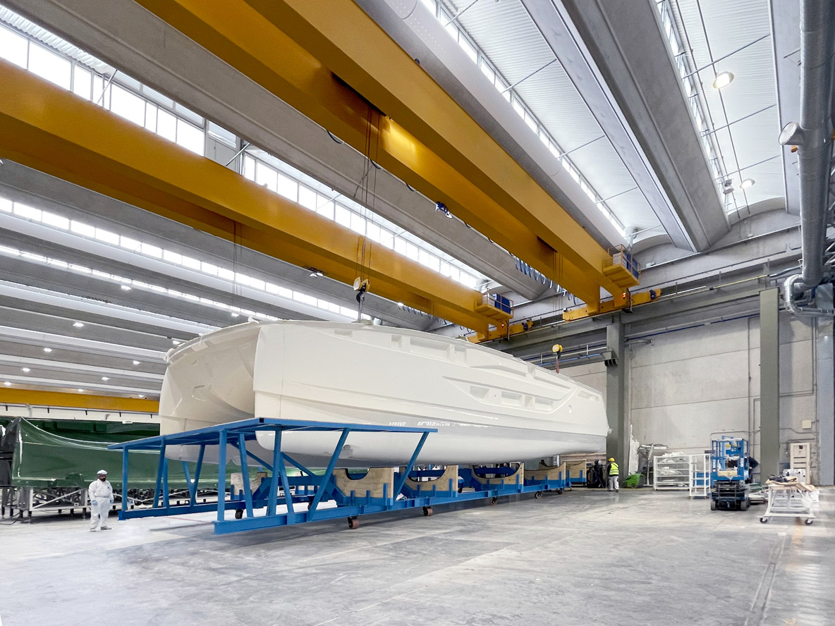C’est en 2010, avec l’apparition des Monte Carlo Yachts, que le Groupe Bénéteau s’est installé en Italie, à Monfalcone, tout au nord de l’Adriatique. Cette situation en bord de mer est idéale pour mettre facilement les grandes unités à l’eau, et le climat de l’endroit est suffisamment clément pour organiser des essais clients même pendant l’hiver. Les installations ultra-modernes de 18 000 m² (sur un espace total de 45 000 m²) comprennent des hangars de moulage et d’assemblage à la température maîtrisée entre 18 et 25 °C toute l’année. Ces hangars dont le sol est chauffé ou refroidi à l’eau sont aussi aérés grâce à un réseau d’extracteurs pour contrôler l’hygrométrie. En 2015, l’installation d’un hall de peinture de 60 mètres de long chauffant à 80 degrés marque une étape supplémentaire pour la qualité. En plus de la peinture, il permet aussi de passer coques et structures à une cuisson post-infusion pendant huit à dix heures pour obtenir une meilleure rigidité d’ensemble. Le chantier est alors logiquement monopolisé pour la construction des plus grandes unités du groupe. Après les Monte Carlo Yachts, ce sont les CNB 66 et 76 qui ont été construits ici avant de partir pour Forli. Aujourd’hui, le planning annuel de production prévoit onze Grand Trawler Bénéteau, huit Jeanneau Yacht 66 et huit Prestige M8. Sur les 250 personnes qui travaillent à Monfalcone, 170 sont à la production, tandis que 80 occupent les bureaux – dont plus de 30 techniciens. Mais si le site a été choisi par le Groupe Bénéteau pour construire ses yachts haut de gamme, exercice où la customisation et les belles finitions sont primordiales, c’est aussi en grande partie pour l’excellence de la main-d’œuvre italienne. La culture du « beau » est une raison d’être pour de très nombreux artisans qui ont été habitués à combler le désir de riches armateurs. Les menuiseries en Alpi sont livrées par des entreprises locales réputées, avant d’être assemblées en ateliers – idem pour les vaigrages et certaines pièces de décoration. Ce travail de très haute qualité encore manuel s’adapte parfaitement aux exigences des finitions semi-custom.