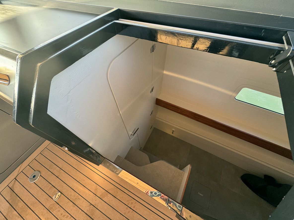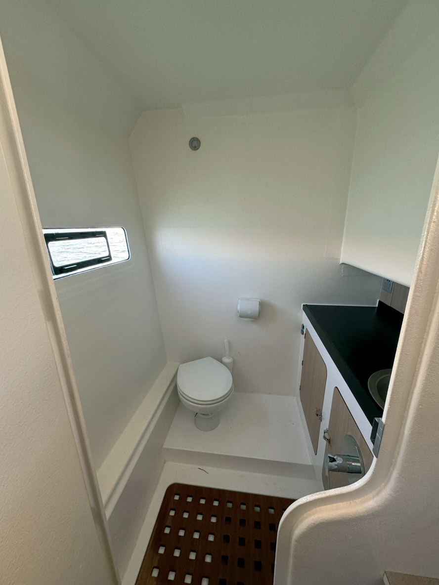 Dans la nacelle, on découvre une banquette dans le sens de la marche à tribord. En face se trouve une belle cuisine et encore un carré tout à l’avant. A tribord, sous le pare-brise, le pilote est parfaitement installé dans son siège réglable avec repose-pieds face à un tableau de bord ultra-moderne. Deux descentes (elles sont décalées) mènent chacune à une cabine double dotée d’une coursive avec rangements et d’une salle d’eau privative. La pente est raide, aussi, le constructeur a adopté des marches en quinconce, comme on en trouve habituellement sur des unités de 15 pieds de moins ; ce petit détail – tout comme la limitation du nombre de cabines –, rappelle que le Sunmare 50 n’a aucunement l’ambition de concurrencer le marché classique des powercats de 50 pieds taillés pour la croisière côtière ou semi-hauturière. Maestro est bien conçu pour des sorties à la journée – d’où ce traitement quelque peu secondaire des cabines du bord.