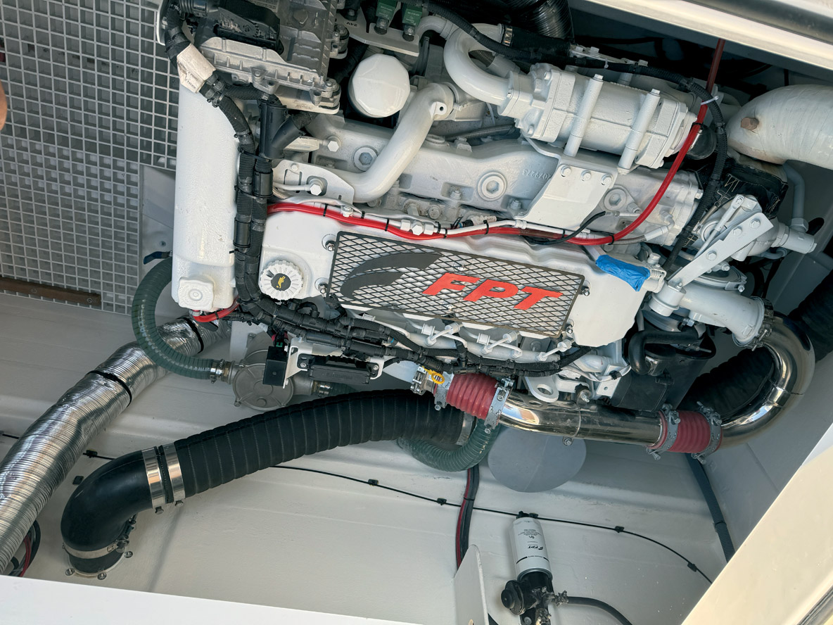 Les deux blocs FTP N67 de 6,7 l de cylindrée développent chacun 480 ch ; une belle puissance qui s’entend dès le démarrage des moteurs de 721 kg pièce. On n’est pas du tout dans la fougue d’un offshore dont les manettes n’attendent que de monter dans les tours et de faire hurler la mécanique, mais bien plus dans l’expression de deux gros diesels façon pick-up à l’américaine. Ça pousse très fort avec du couple dès les bas régimes et un bruit plutôt agréable, presque rassurant. La vitesse de croisière cible est de 17/18 nœuds ; c’est la vitesse atteinte juste après que la carène sort pour partie de l’eau. A fond, à 3 200 tours, on atteint 22 nœuds, pas plus. L’ambiance est décidément à la force tranquille. Du côté de la consommation, on relève 20 litres/heure à 8 nœuds, 50 à 15 et près de 200 à fond. Le contrôle du Sunmare 50 est facile, avec une excellente sensation d’aisance, de légèreté et de glisse. Le pilote profite toujours d’une bonne visibilité sur le plan d’eau ; grâce au pont relativement plongeant, l’assiette cabrée lors de l’accélération ne se traduit pas par un effet « capot ouvert ».