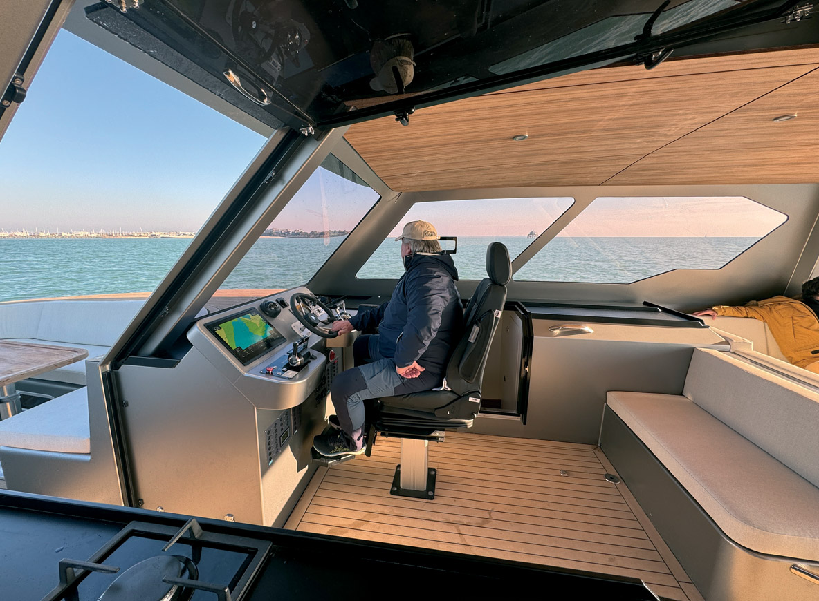 Notre modèle d’essai ne disposait pas encore de ses deux moteurs électriques de 15 kW ; cette propulsion verte ne prétend pas se substituer aux deux puissants diesels, mais permet d’évoluer sans émissions à 5 nœuds pendant une heure ou deux. L’idée est d’être autorisé à naviguer à faible vitesse dans des sanctuaires marins où les rejets carbonés sontinterdits.