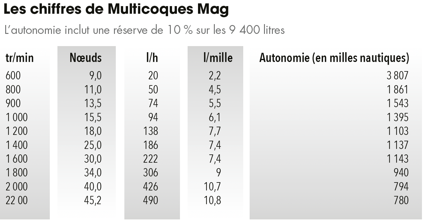 Si une vitesse plus tranquille de 13,5 nœuds vous suffit, vous aurez largement de quoi faire, au départ d’Auckland, un aller simple jusqu’à Cairns, soit presque 2 000 milles. A 30 nœuds, une croisière rapide aux Fidji (1 160 milles) est possible. A 34 nœuds, vous aurez assez de carburant pour aller jusqu’à Nouméa (975 milles).