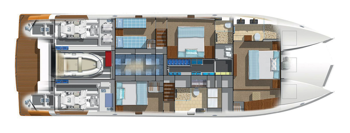 De toute évidence, nous avons affaire à un multicoque conçu pour se distraire avec des amis et partir pour de longues croisières. Le grand cockpit accueille des chaises individuelles, mais vous pouvez choisir n’importe quelle autre configuration pour les sièges. A l’avant du cockpit se trouvent un grand réfrigérateur/congélateur, un grand rangement à bâbord pour les cordages et un cabinet de toilette à tribord.
