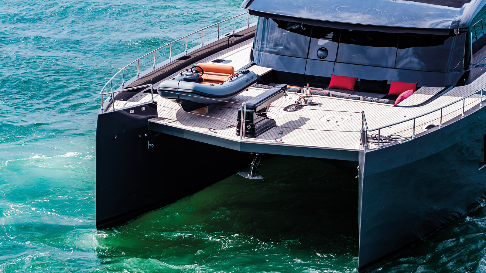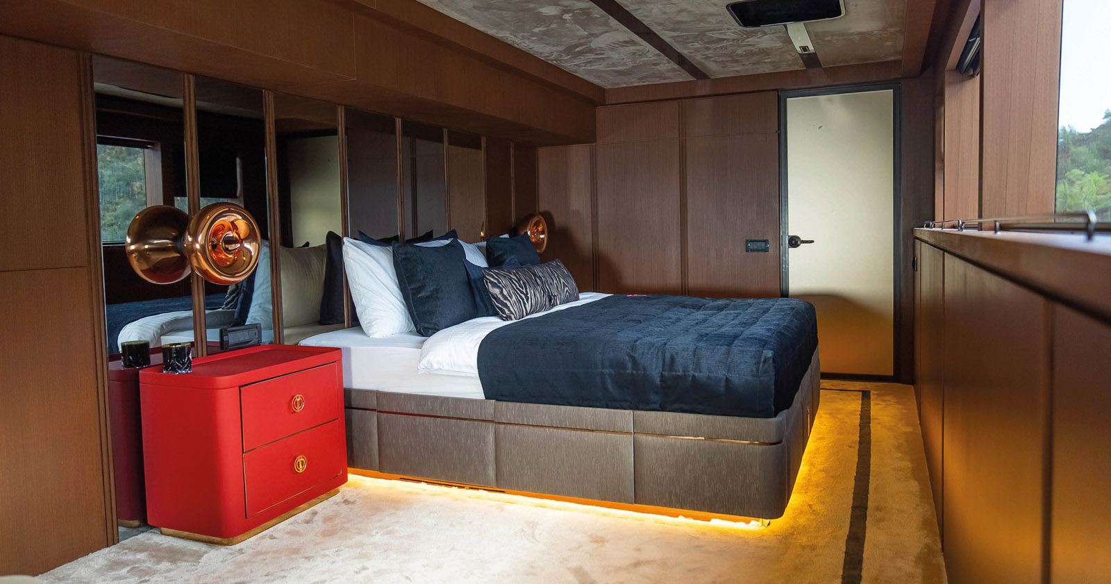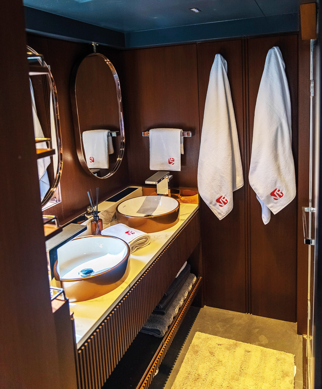 Au moment de monter à bord, face à la volée de marches des jupes arrière, on relève l’absence de plate-forme hydraulique entre les coques. En fait, l’annexe est disposée sur la plage avant avec une grue pour la mise à l’eau. Une bonne raison à ce choix, nous y reviendrons. Très haut de franc-bord, ce catamaran se différencie de ses concurrents par un maître-bau bien plus étroit – 9,56 mètres, alors que ses congénères affichent bien plus de 11 voire 12 mètres. Là aussi, il y a une explication… Même avec deux mètres de largeur en moins, l’espace à bord reste impressionnant. Hormis les jupes, la nacelle occupe toute la longueur du pont principal. Les coques et le flybridge offrent une surface utile avoisinant les 300 m². Bref, de quoi faire un joli pied à terre… sauf qu’on est bien sur l’eau ! L’analogie n’est pas gratuite : ce que recherche la clientèle de ce type de navire, ce sont les prestations d’un appartement de très haut standing, luxueusement ornementé. Pour la décoration, l’architecte d’intérieur Seda Ünay a utilisé exclusivement des matériaux nobles. De la belle boiserie en noyer, des cuirs, de l’alcantara, des velours, des tapis de laine épaisse et enfin du marbre très fin habillent le mobilier du salon, des cabines et des salles de bains. L’ambiance de ce premier exemplaire de la série est résolument orientée vers des teintes foncées de marron, gris et bleu, rehaussée ici et là par des ajouts de couleurs plus claires comme le marbre de la table – ou plus vives, à l’instar des dorures des vasques ou encore le cuir rouge des tables de nuit. L’ensemble donne une ambiance fastueuse qui peut être adaptée au goût du propriétaire, comme c’est la règle sur ce type d’unités.
