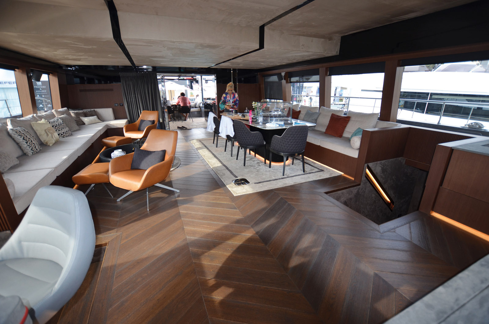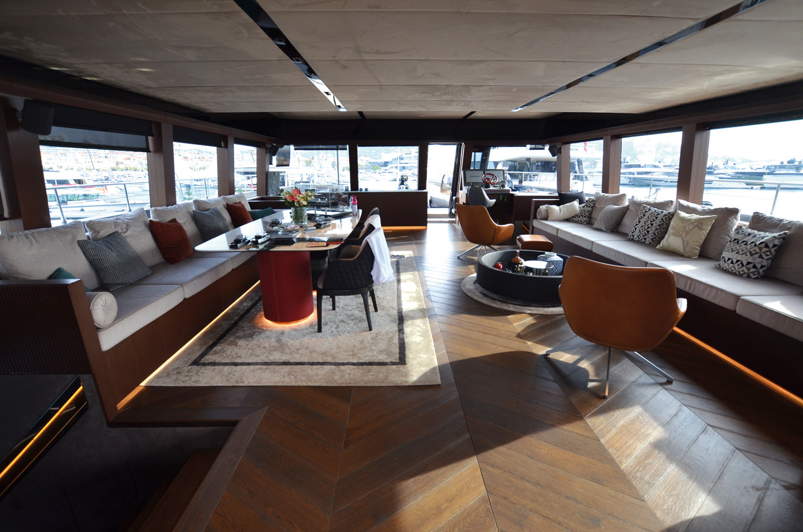 Le salon réalisé sur-mesure du Vision F 80 est très vaste. Les grands canapés sont accueillants et l’on peut recevoir beaucoup d’invités à bord. La vue sur l’extérieur est agréable pour se détendre avec des amis ou la famille, même nombreuse.