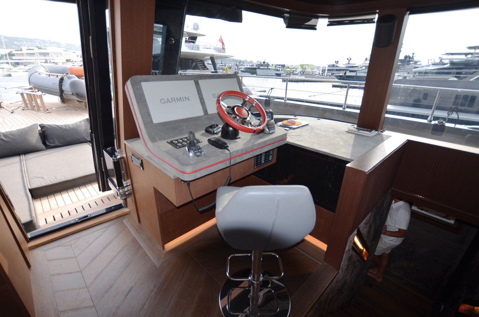 La console du poste de timonerie intérieure est tapissée d’alcantara, pour le plaisir des yeux. On remarque l’absence de propulseur d’étrave sur l’instrumentation – les IPS Volvo sont chargés d’assurer des manoeuvres de port sereines.