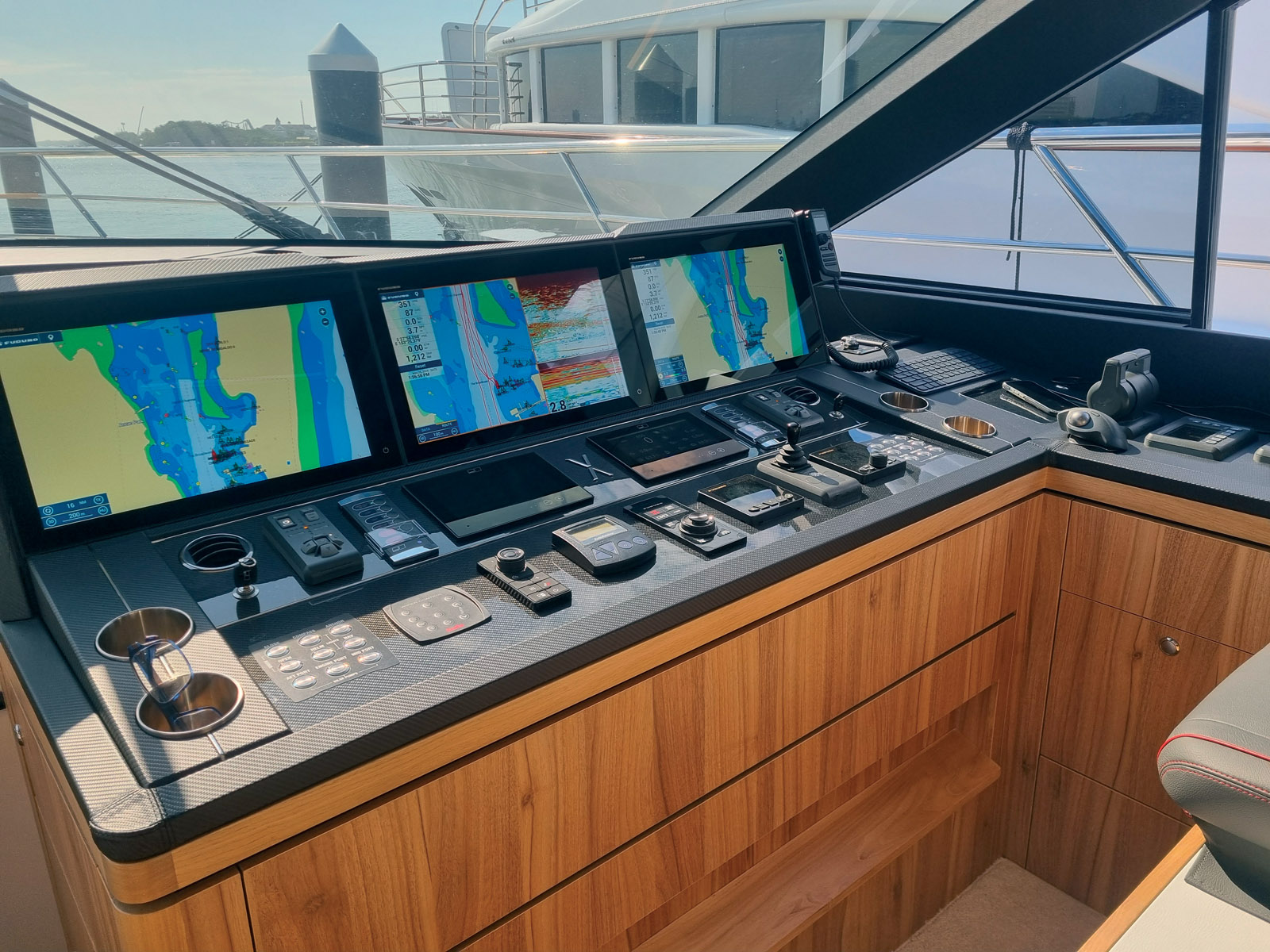 Face au salon, sur tribord, se trouve le poste de pilotage, dont la caractéristique la plus remarquable est l’absence de volant. A la place, un petit joystick permet de commander les propulseurs à jet pour diriger le XF75. A côté, un autre joystick permet de manœuvrer lentement et de contrôler les propulseurs avant et arrière (en option), mais ils ne sont pas absolument nécessaires grâce à la précision des commandes des jets. On trouve également deux manettes pour les deux moteurs MTU et, finalement, la console est surmontée par trois écrans de navigation Furuno qui sont facilement lisibles depuis les deux sièges baquets. Parmi les autres équipements intelligents essentiels, citons le pilote automatique Furuno et l’écran du moteur MTU, les autres systèmes du catamaran étant gérés par le système de bus numérique Czone. Les fenêtres à ouverture électrique de chaque côté sont idéales pour permettre au skipper de communiquer avec l’équipage sur le pont ou de faire entrer de l’air frais, et, avec les repose-pieds, complètent un poste de pilotage très bien pensé.